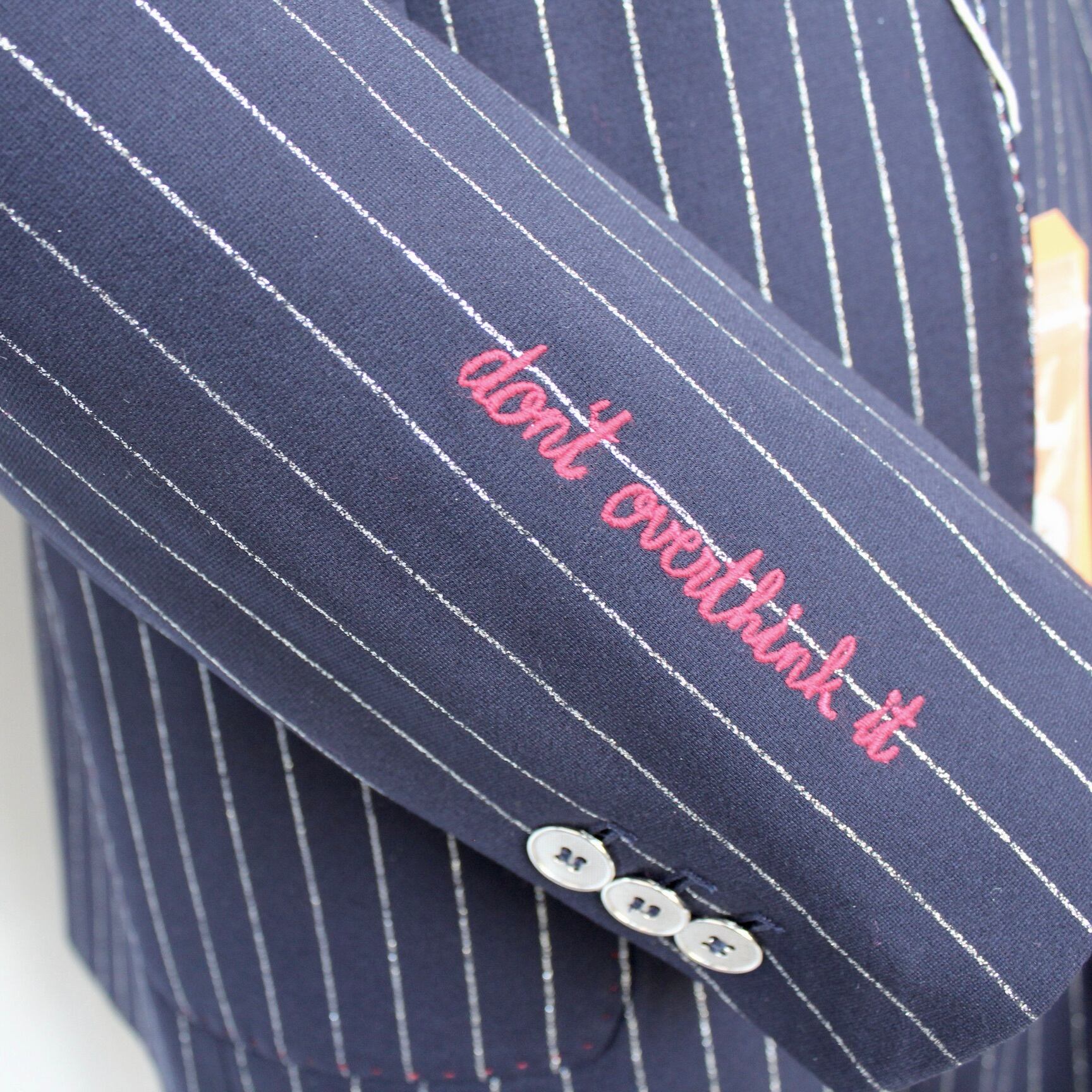 **VILAGALLO ダークネイビー✖️シルバーラメピンストライプストレッチジャケットは、エレガントで清楚な落ち着いたネイビーに煌めくシルバーラメのピンストライプが大人の魅力を引き立て、裏地から、さりげないステッチ刺繍が施された、特別感溢れるアイテムです!ストレッチ性の高い素材が体にフィットし、動きやすさを保ちながらも洗練されたシルエットを実現します♪ スペイン製の高品質な生地を使用しており、しっかりとした作りが魅力の一枚です。**