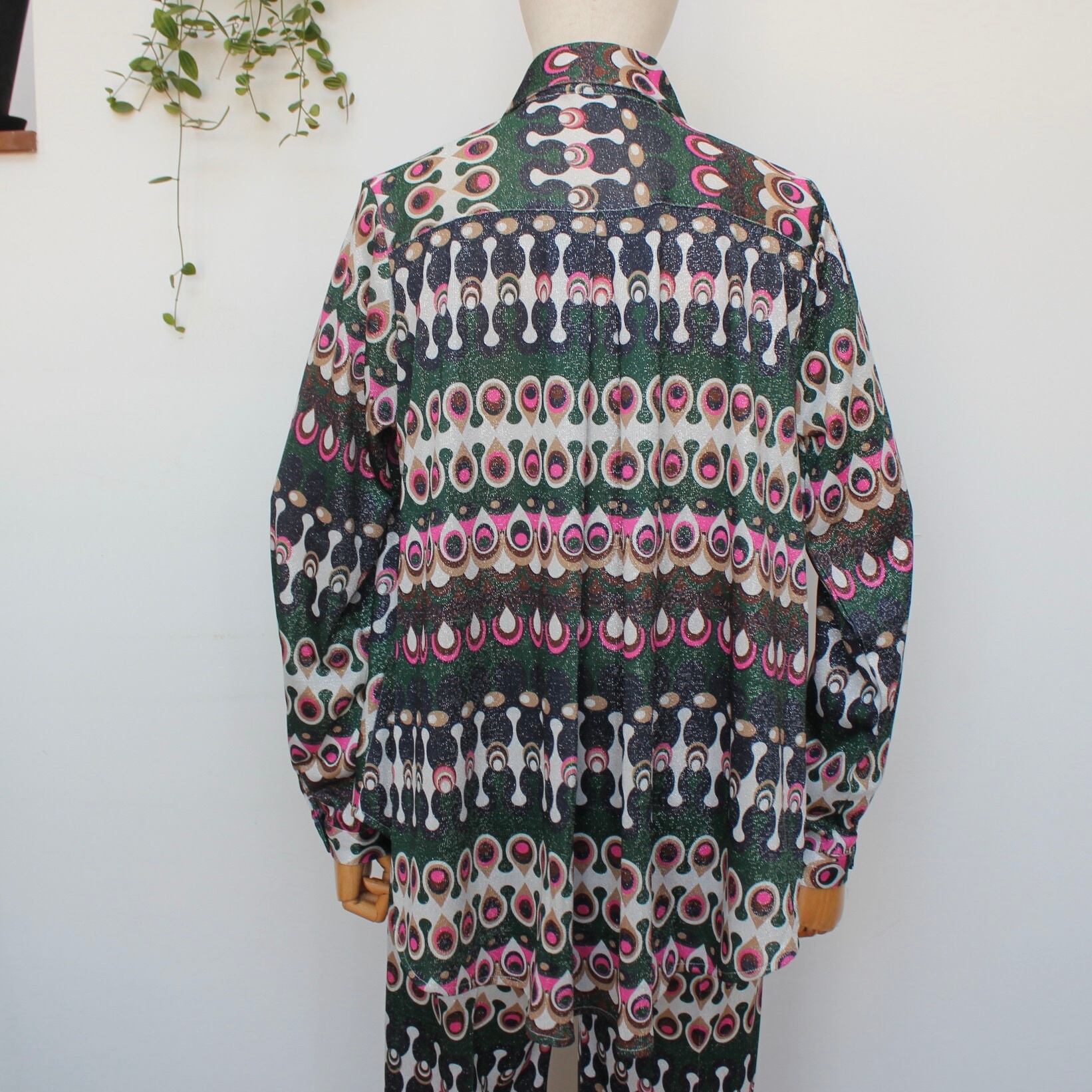 **VILAGALLO グリーン, ネイビー, ピンクポイント幾何学プリントラメ入りストレッチセットアップブラウスは、落ち着きのあるグリーンとネイビーに遊び心を加えたピンクの幾何学プリントが施されており、華やかさと洗練さを兼ね備えた特別なアイテムです!ラメ入りのストレッチ素材により、日常使いながらも気品のあるスタイルが実現でき、快適な着心地を保っています♪ スペイン製の高品質な作りで、ビジネスからカジュアルシーンまで幅広く活躍することが可能です。**