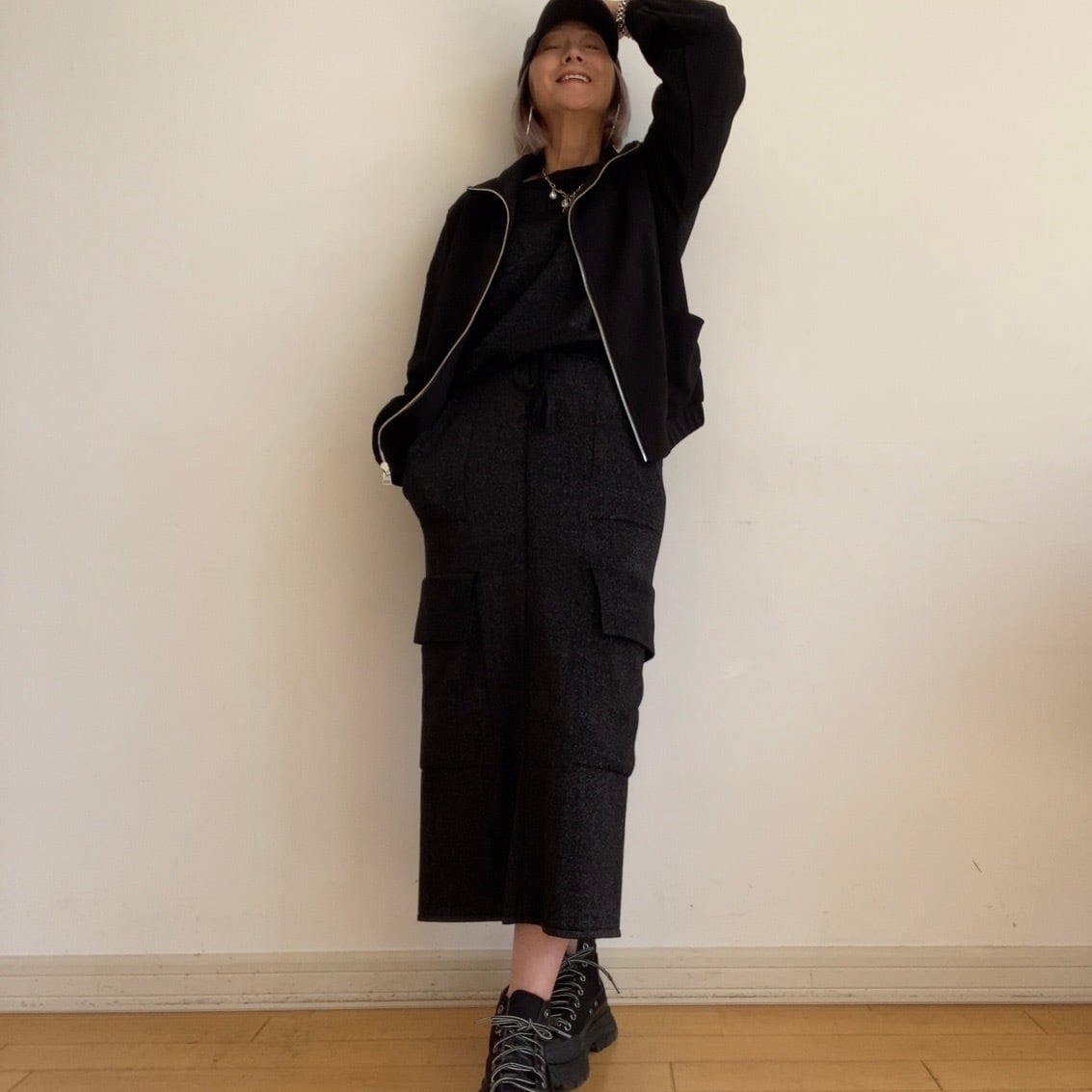 このブルゾンは、ボトムやスカートとのコーディネートで、さりげないおしゃれを楽しむことができます!今日は、シンプルなブラックTシャツとラメ入りニットスカートと合わせてカジュアルダウンしたスタイルを楽しんでみました。重ね着やアクセサリーで、あなたの個性を引き立てる一枚として、ぜひワードローブに加えてみてください。