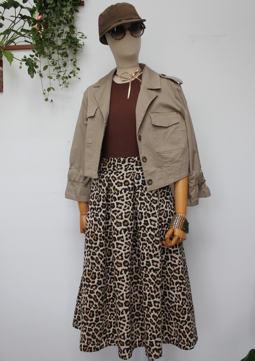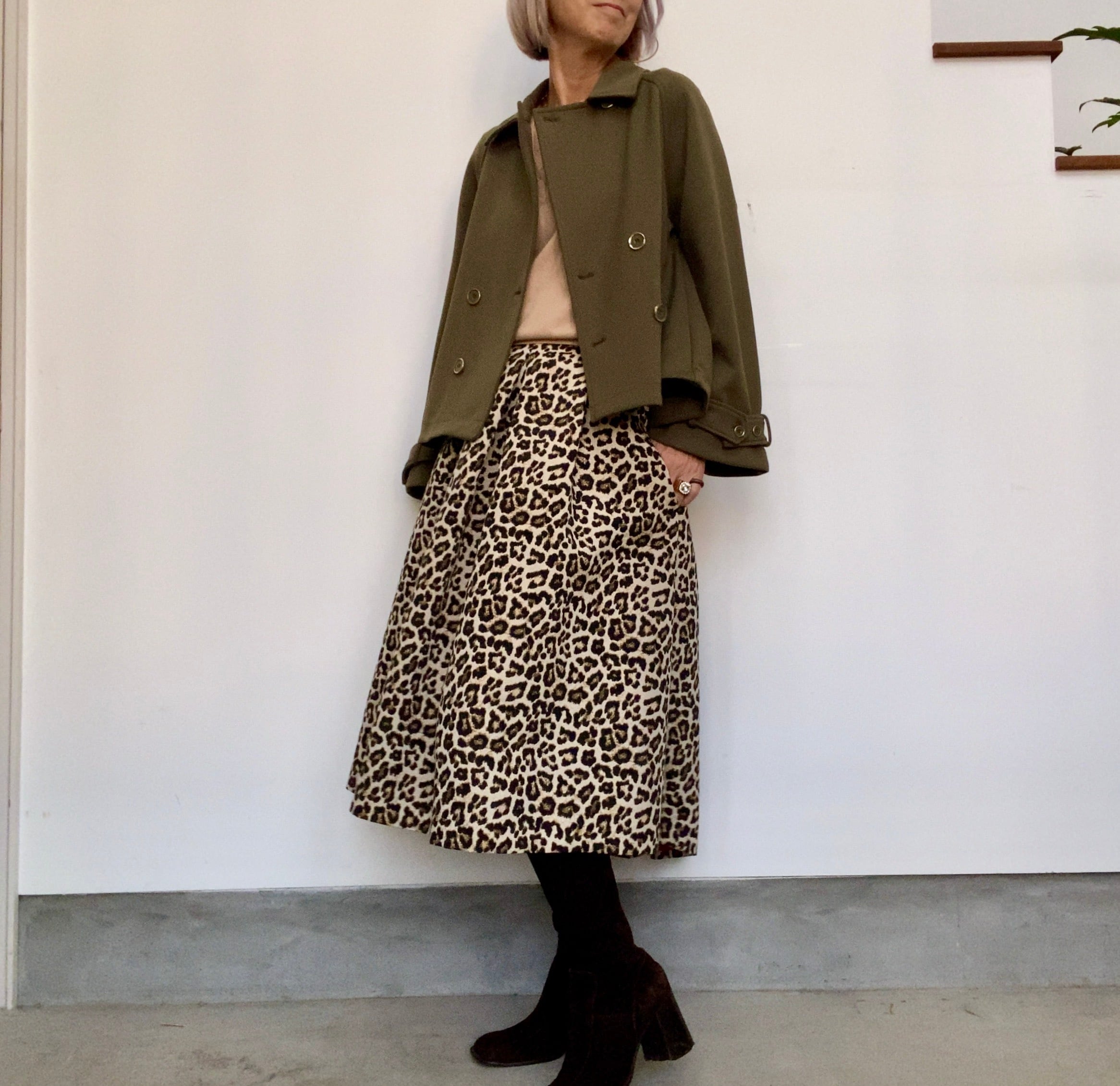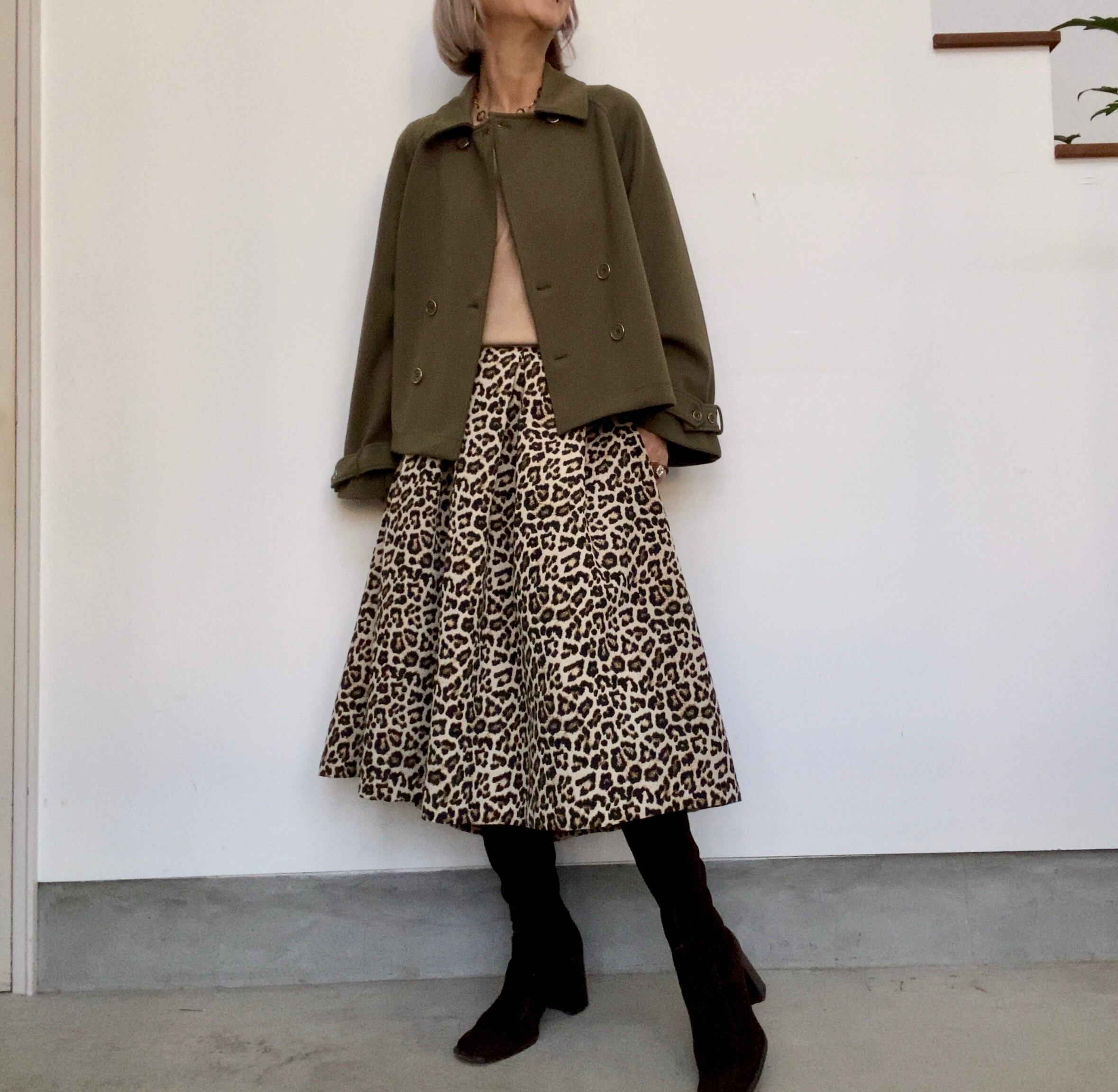 このスカートは、シンプルなトップスやアウターとのコーディネートで、日常から特別なシーンまで幅広くおしゃれを楽しむことができます!今日は、シンプルなブラウンニットとトレンチジャケットと合わせて、カジュアルでありながらもひと際目を引くスタイルを楽しんでみました。アクセサリーやシューズで自分だけのスタイルを演出し、ぜひこの特別なレオパードスカートを一枚をワードローブに加えてアヴァンギャルドを楽しんで見て下さいませ。。