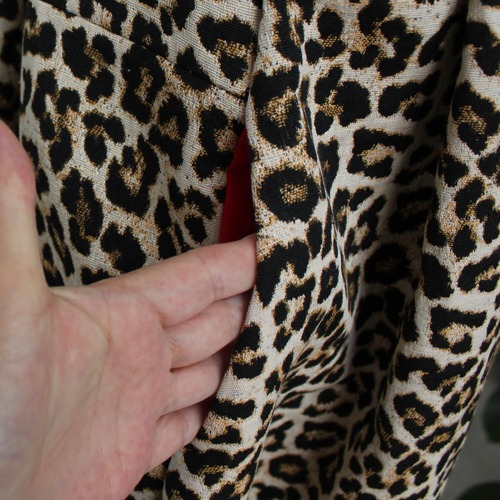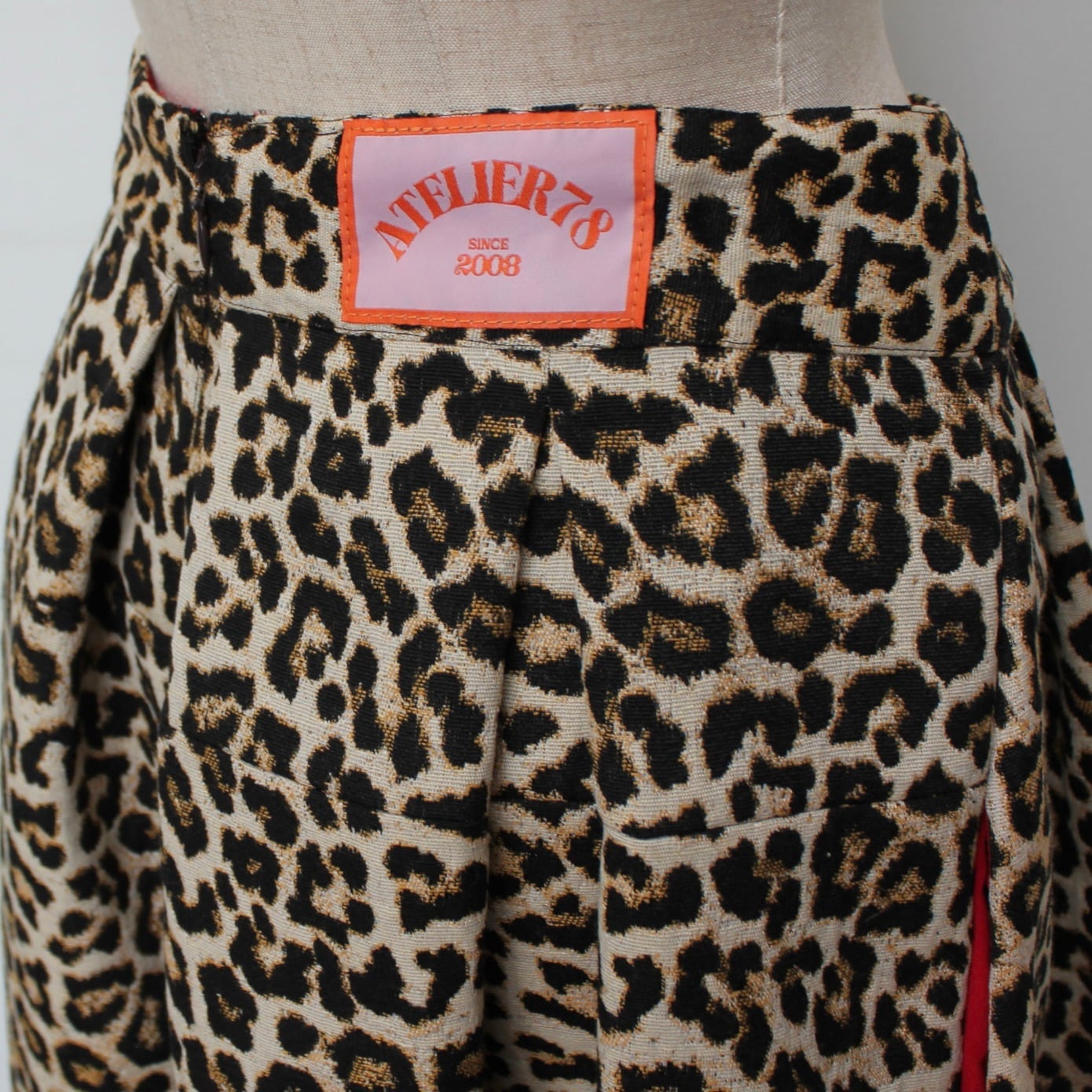 人気の**78オリジナル ハンドメイドレオパードスカート、今季はフランス製ゴブラン素材を使用して、程よいフレアーが素敵な、タックフレアースカートデザインに。エレガントでありながら可愛さもある個性的なデザインが際立つ一着です!洗練されたレオパード柄が印象的で、フランスゴブラン素材を使用することで高級感が溢れています♪タックフレアーのシルエットは女性らしさを引き立て、体型を美しくカバーしながら、動くたびに優雅な表情を見せてくれます。さらに、バックを少し長めにした、フィッシュテールシルエットに、ウエスト裾、ポケットにレッドのポイントをプラスして、さり気ないデザインもい。しっかりとした生地感があり、着心地も抜群で、デイリー、お出かけから、パーティーまでシーンを問わず活躍するアイテムです。**