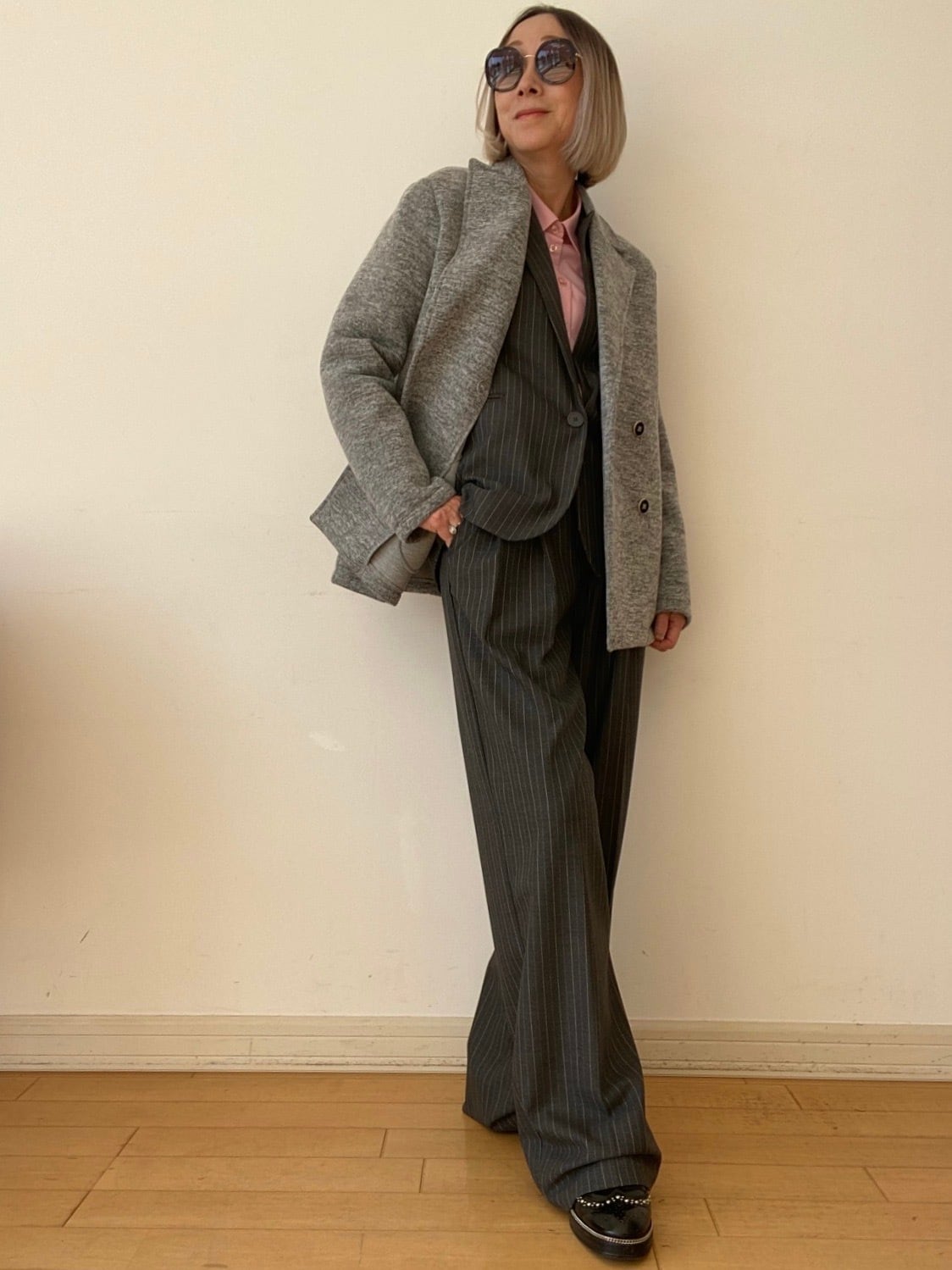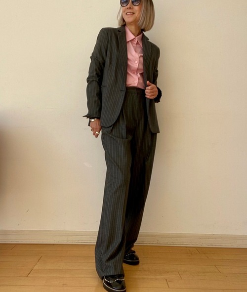 このパンツは、シンプルなブラウスやニットと合わせることで、デイリールックからフォーマルワーキングシーンまで幅広く活用可能です!今日は、ベージュトーンの優しいブラウスに、セットアップのジャケットを合わせてスタイリッシュなコーディネートに仕上げてみました。このパンツをぜひあなたのワードローブに加えて、新たなスタイルの幅を楽しんでください。