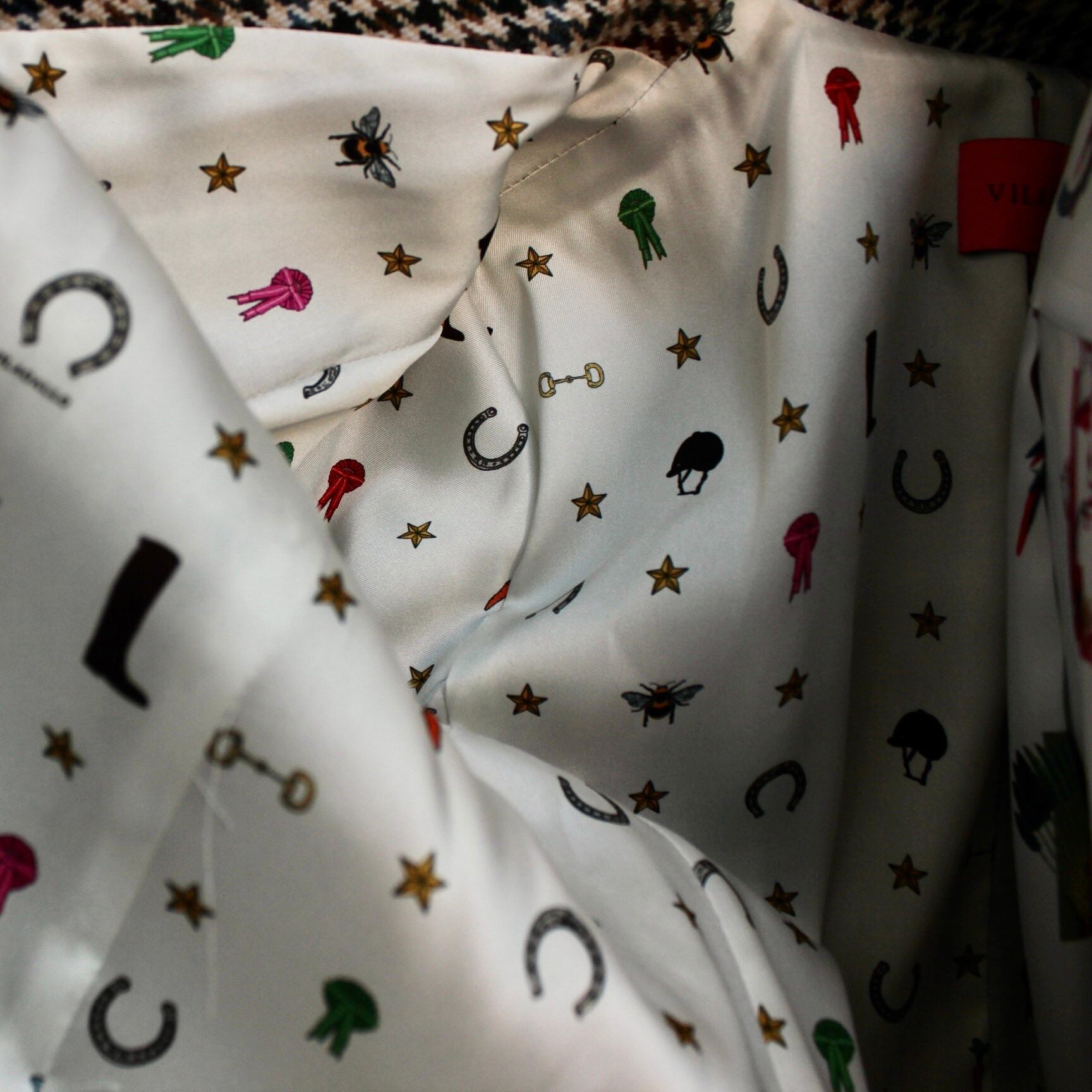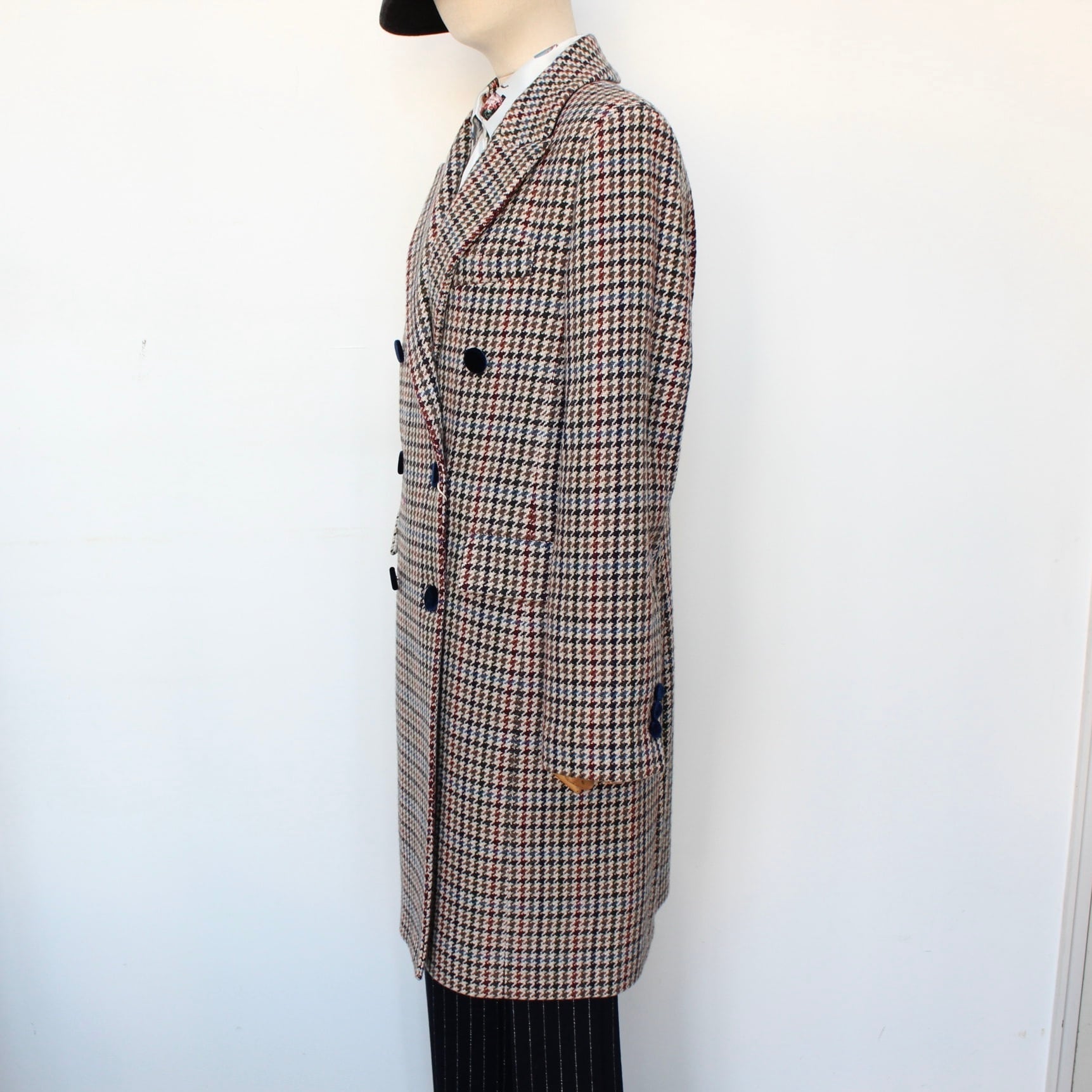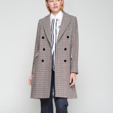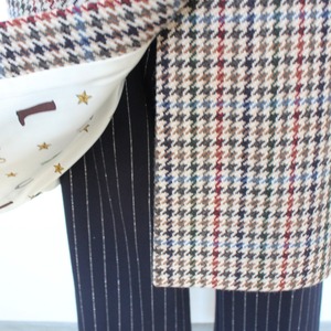 **VILAGALLO ハウンドトゥースチェックウール混ブリティッシュコートは、エレガントなデザインと優れた保温性を兼ね備えた特別なアイテムです!クラシックなハウンドトゥースチェック柄が、洗練された印象を与え、どんなコーディネートにも華やかさをプラスします♪ スペイン製の高品質ウール混素材を使用しており、しっかりとした暖かさを提供してくれるのに加え、柔らかな着心地も実現。裏地プリント、ネイビーベロアクルミボタン等細部にまでこだわった仕立てが、あなたをより魅力的に引き立てます。**