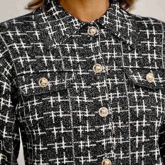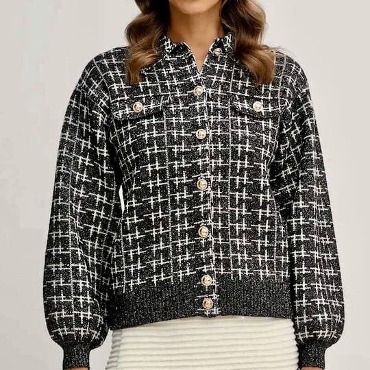 このジャケットは、カジュアルからビジネ、フォーマルススタイルまで幅広いシーンで重宝します!今日は、同じモノトーンのチェック柄のニットスカートと合わせて、上品でエレガントでありながらも印象的なスタイルを楽しんでみました。このジャケットをぜひあなたのワードローブに加えて、多彩なコーディネートをお楽しみください。