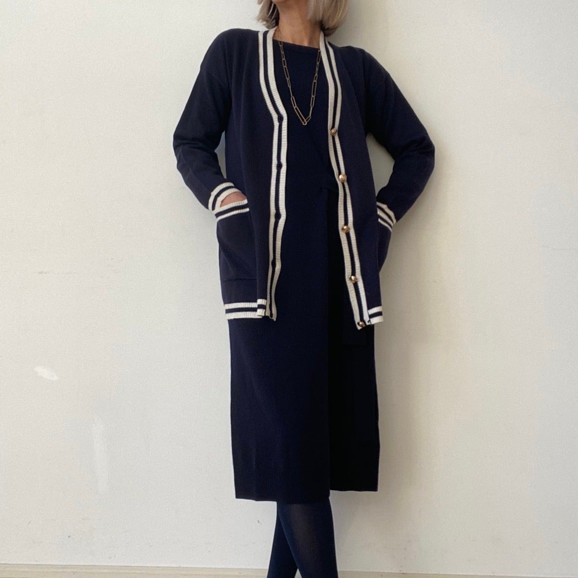 **GAUDI ウールカシミヤ混ネイビーウエストポイントニットワンピースは、上品で落着いたネイビーが印象的な暖かワンピースです!イタリア製の高品質なウールカシミヤ素材を使用し、肌触りは滑らか、暖かさも兼ね備えています♪ ウエストポイントデザインが美しいシルエットを描き、ボディラインをホローしてくれ美しいシルエットに、シンプルながらも存在感のある一着となっています。カジュアルなシーンからビジネスエレガントシーンまで幅広く対応できるため、日常使いはもちろん、特別な場面でも大活躍間違いなしのアイテムです。**