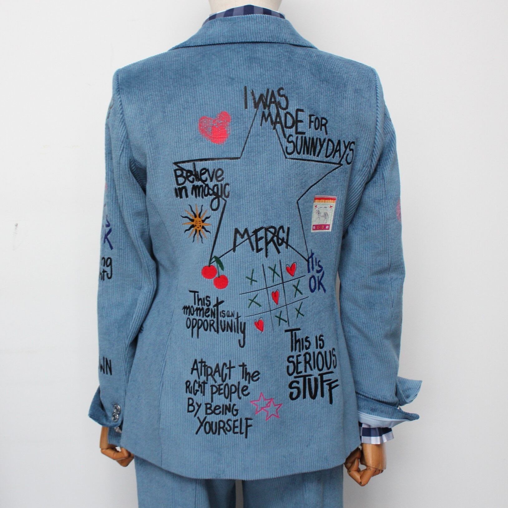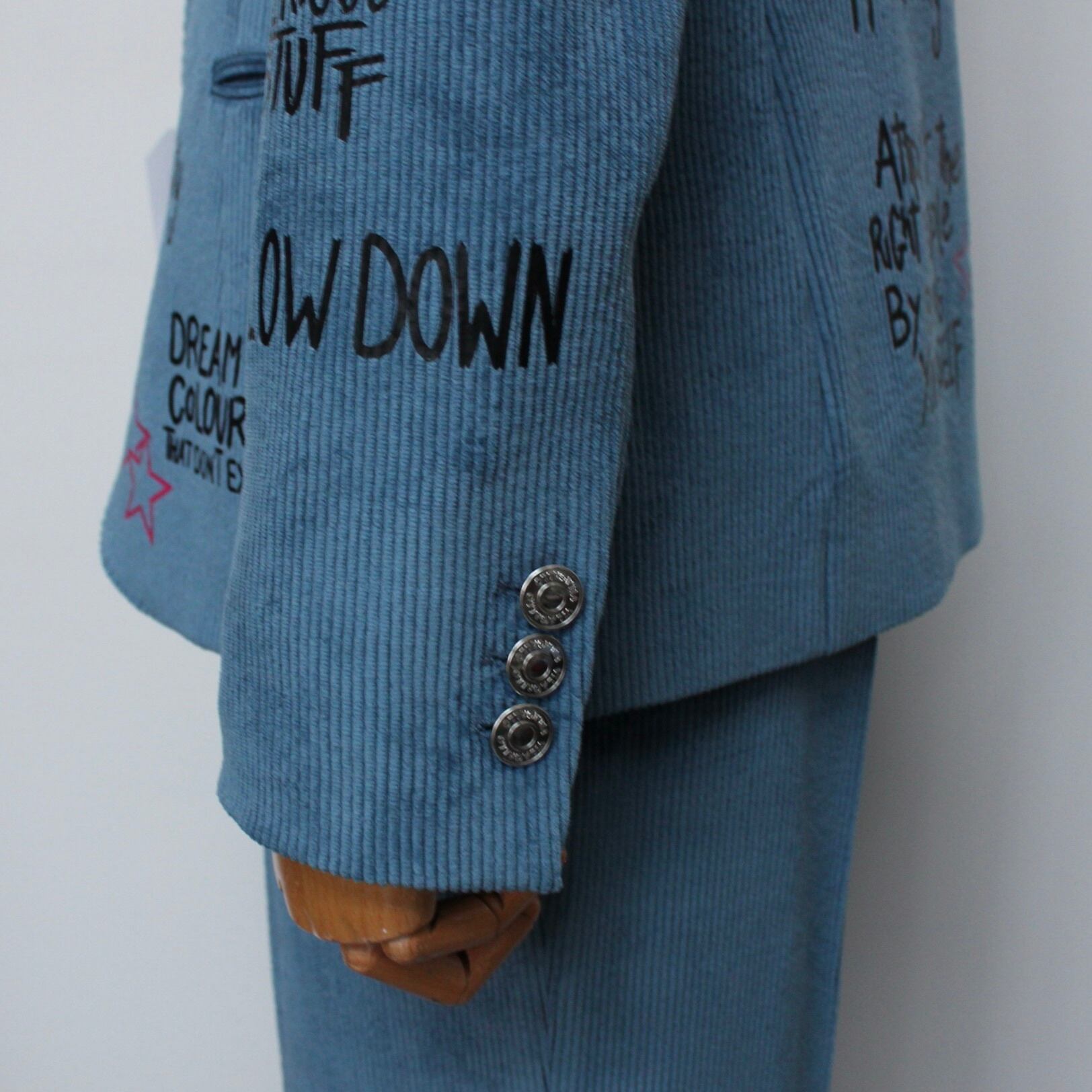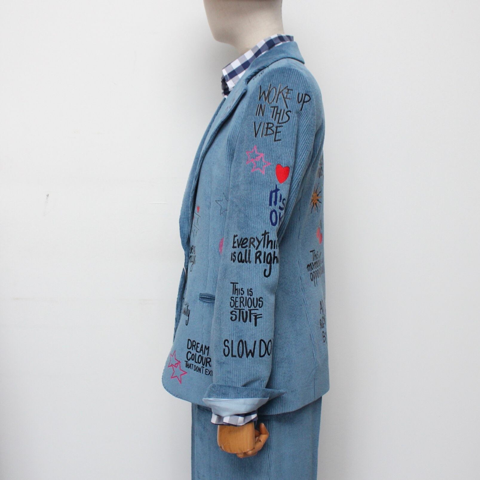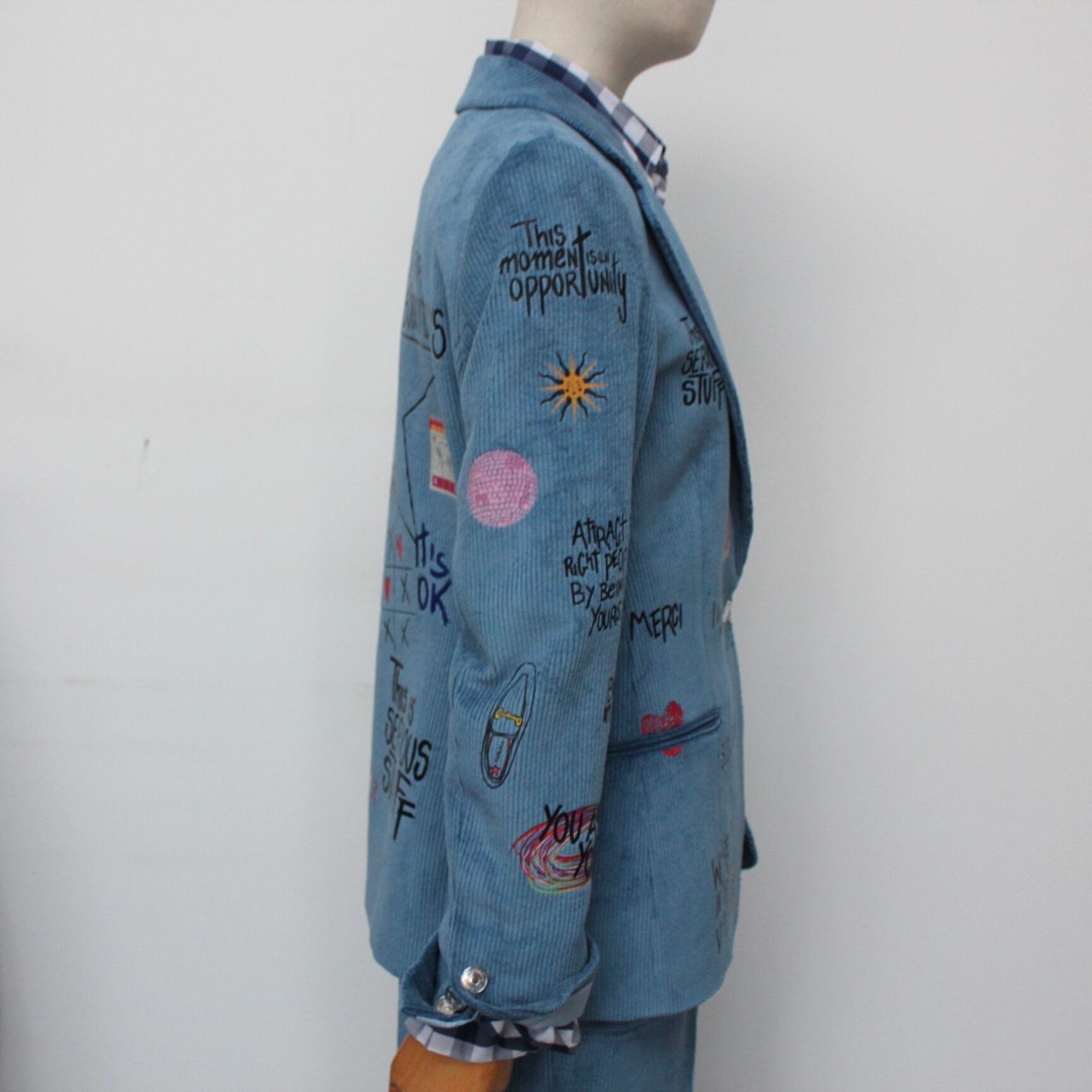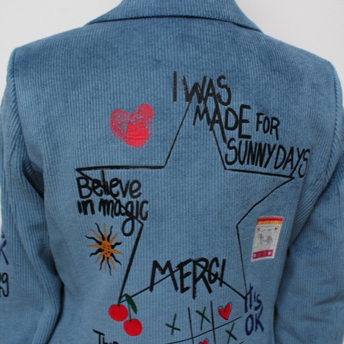 **VILAGALLO アズーロペイントデザインストレッチコーデュロイジャケットは、魅力的なアズーロの色合いとしなやかなストレッチコーデュロイ素材が心地良い着心地に、オシャレで可愛いペイントが高級感あふれるジャケットです!スペイン製の厳選された素材を使用しており、快適な着心地を極めながら、カジュアルでありつつも洗練された印象を与えます♪ 裏地は、ブルー✖️ホワイトのストライプ柄でさり気なくテンションup!このジャケットを羽織ることで、オシャレを満喫し、多様なシーンでの着用が可能で、デイリースタイルから特別なイベントまで幅広く活躍することでしょう。**