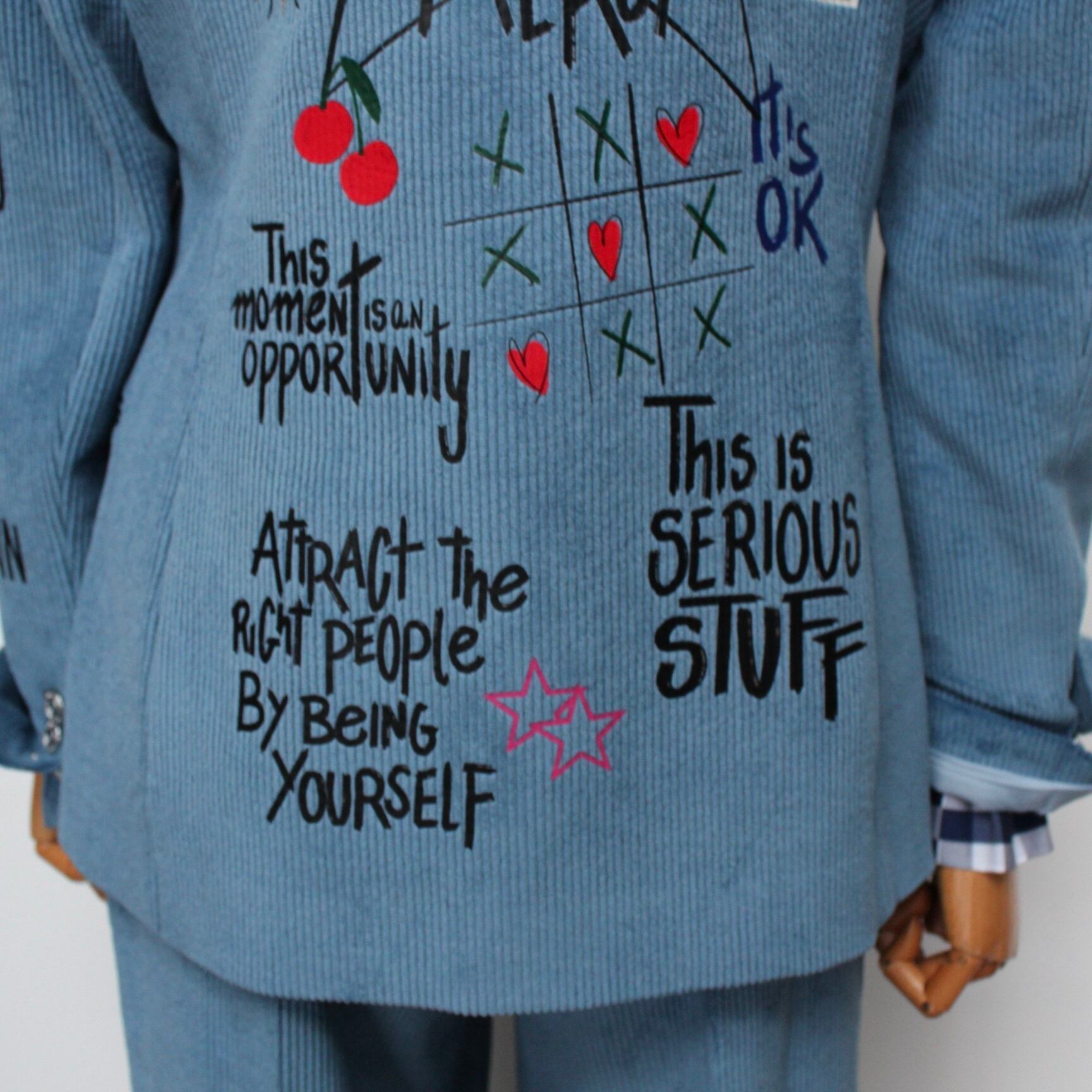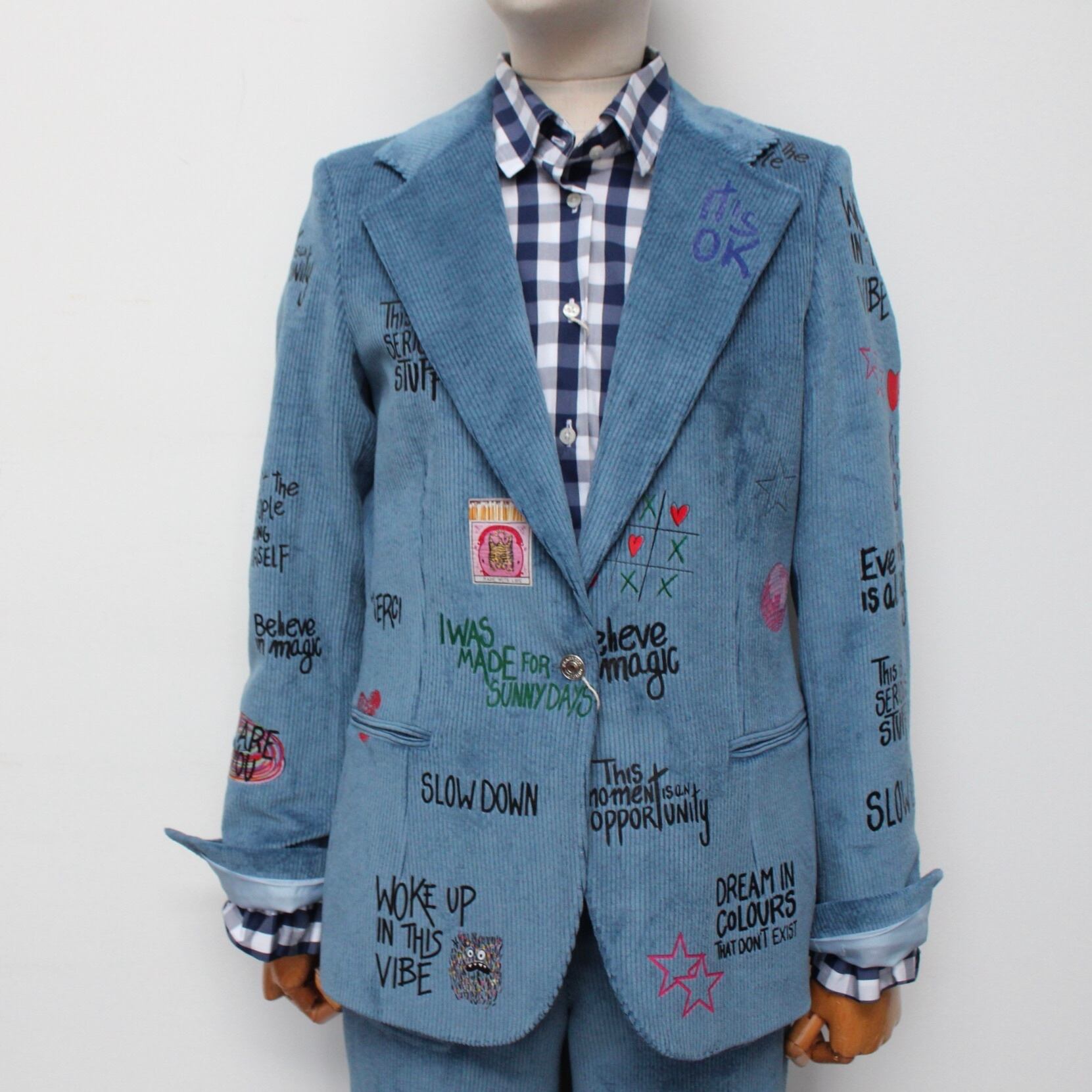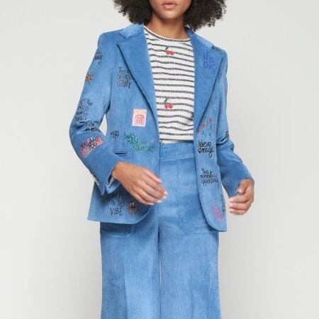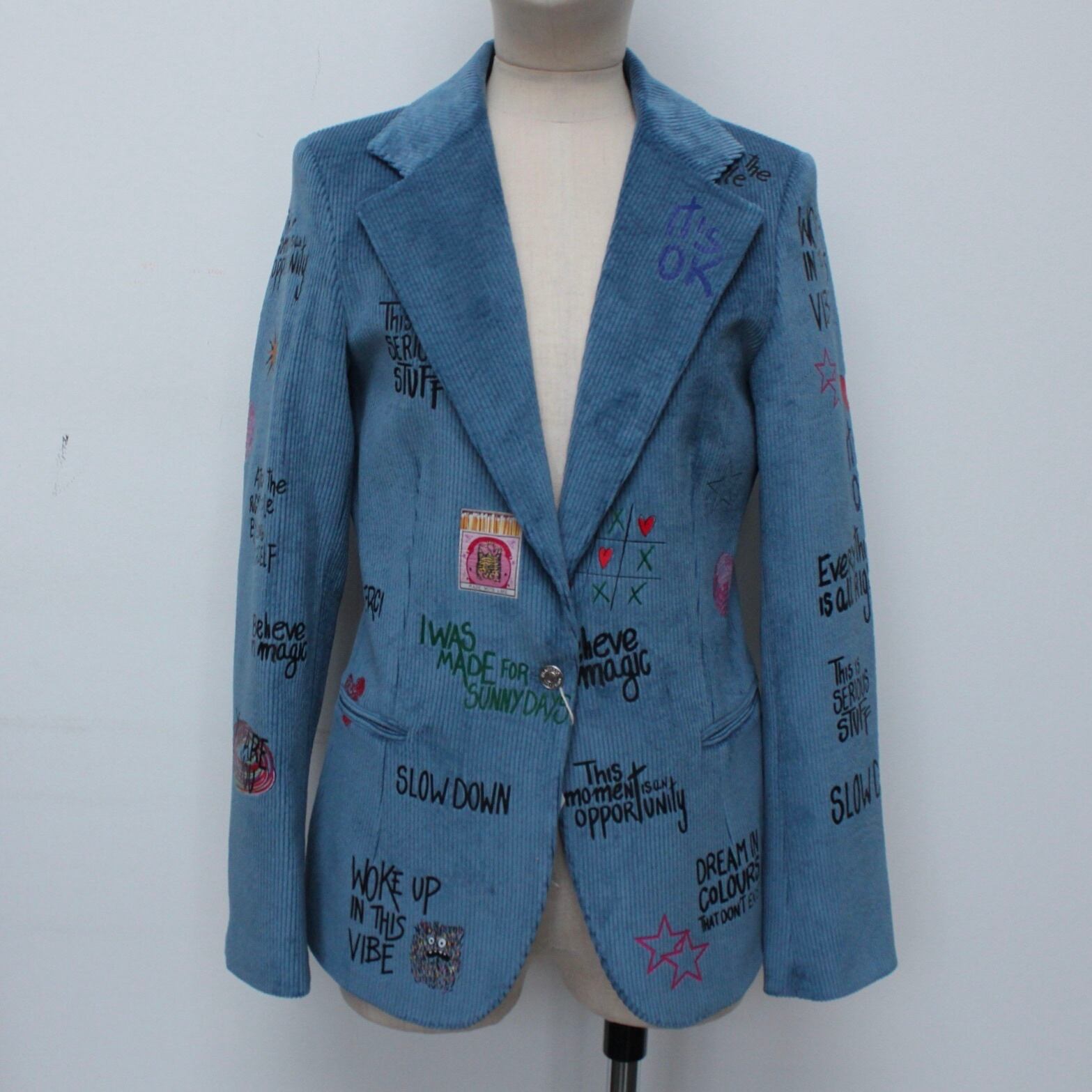 **VILAGALLO アズーロペイントデザインストレッチコーデュロイジャケットは、魅力的なアズーロの色合いとしなやかなストレッチコーデュロイ素材が心地良い着心地に、オシャレで可愛いペイントが高級感あふれるジャケットです!スペイン製の厳選された素材を使用しており、快適な着心地を極めながら、カジュアルでありつつも洗練された印象を与えます♪ 裏地は、ブルー✖️ホワイトのストライプ柄でさり気なくテンションup!このジャケットを羽織ることで、オシャレを満喫し、多様なシーンでの着用が可能で、デイリースタイルから特別なイベントまで幅広く活躍することでしょう。**