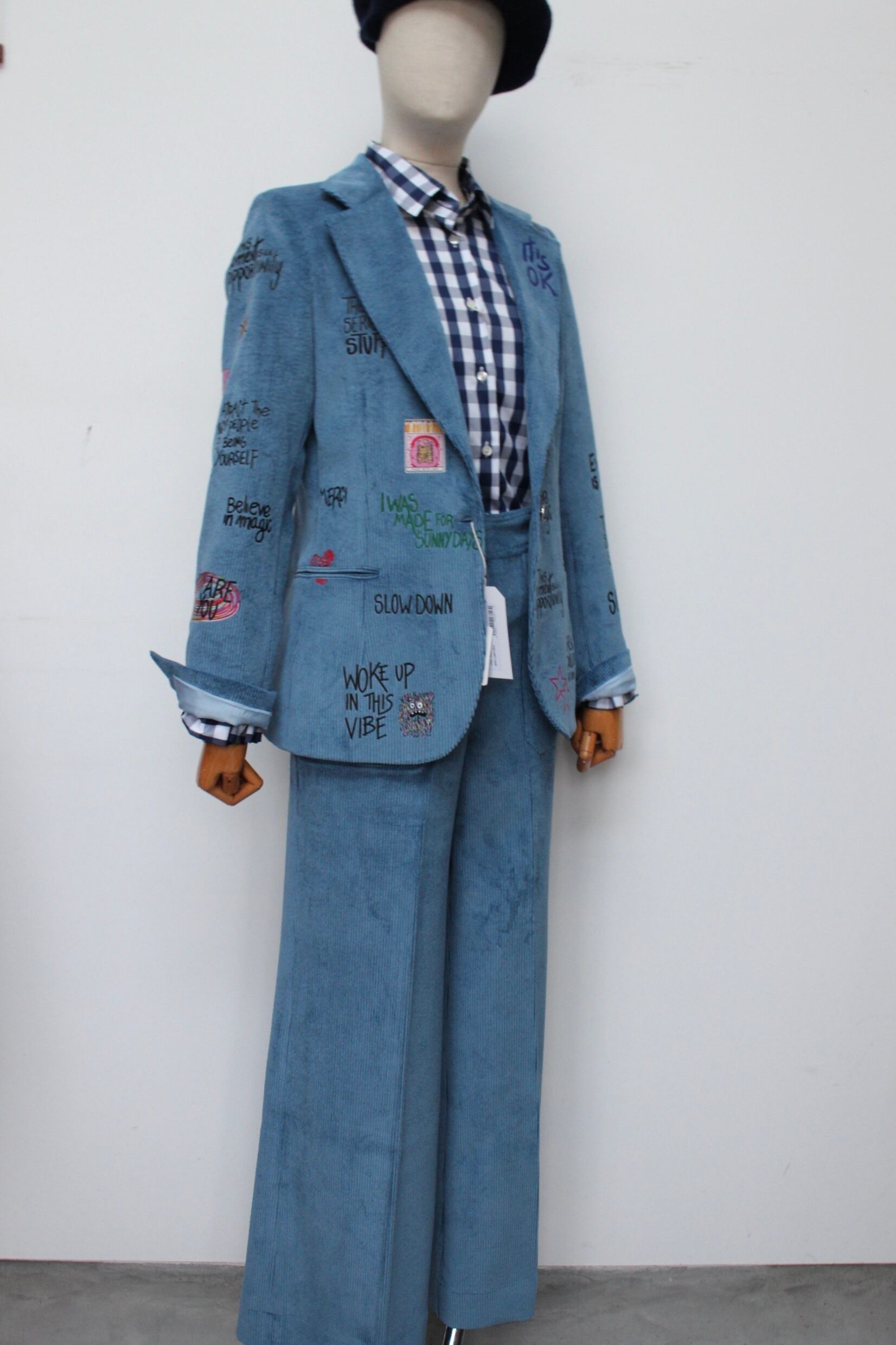 このジャケットは、どんなトップスと合わせる事ができ、、スタイリッシュかつマニッシュなコーディネートを楽しむことができます!さらに、同素材のパンツと組み合わせることで、統一感のある洗練されたスタイルを実現します。他、デニムやウールコットン素材のボトムを合わせて、カジュアルからエレガントなコーデが楽しめます。独自のアズーロペイントデザインが、あなたのファッションセンスを一層引き立ててくれることでしょう。