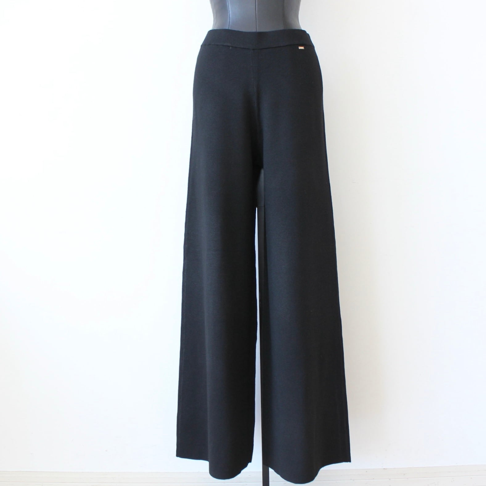 **GAUDI ブラックワイドしっかりニットパンツは、シンプルでありながら、特別感あふれるシルエットが綺麗なデザインが魅力のアイテムです!イタリア製の高品質なニット素材を使用し、しっかりとした素材感が体全体を包み込むような心地よいフィット感を実現しています♪ ワイドシルエットは、リラックスした着用感を提供しつつ、スタイリッシュさを演出します。**