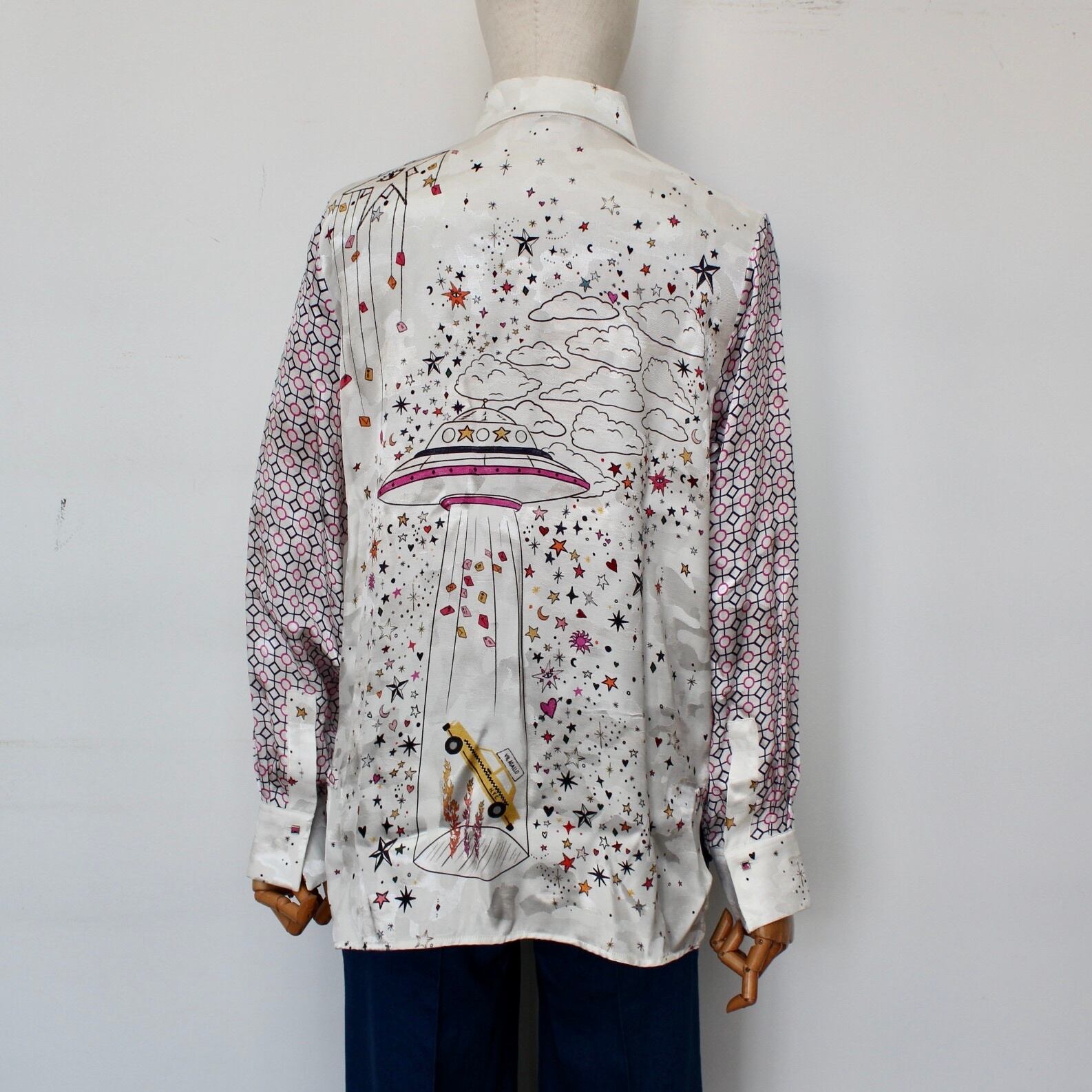 この宇宙✖️幾何学プリントブラウスは、デニムやスカートとのコーディネートが特におすすめで、日常使いにはもちろん、おしゃれなイベントにもぴったりなアイテムです。シンプルなボトムスとの組み合わせで、個性的なデザインを際立たせるスタイルが完成します。この特別なブラウスをぜひあなたのワードローブに加え、ユニークなファッションを楽しんでください。