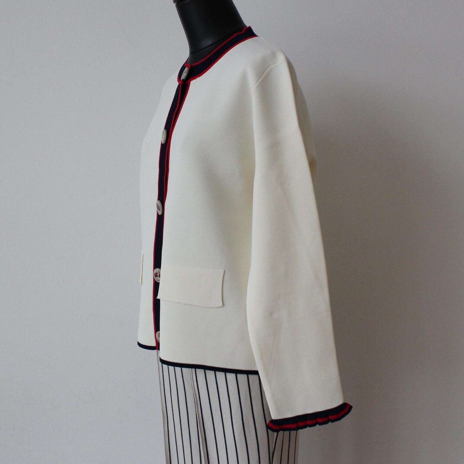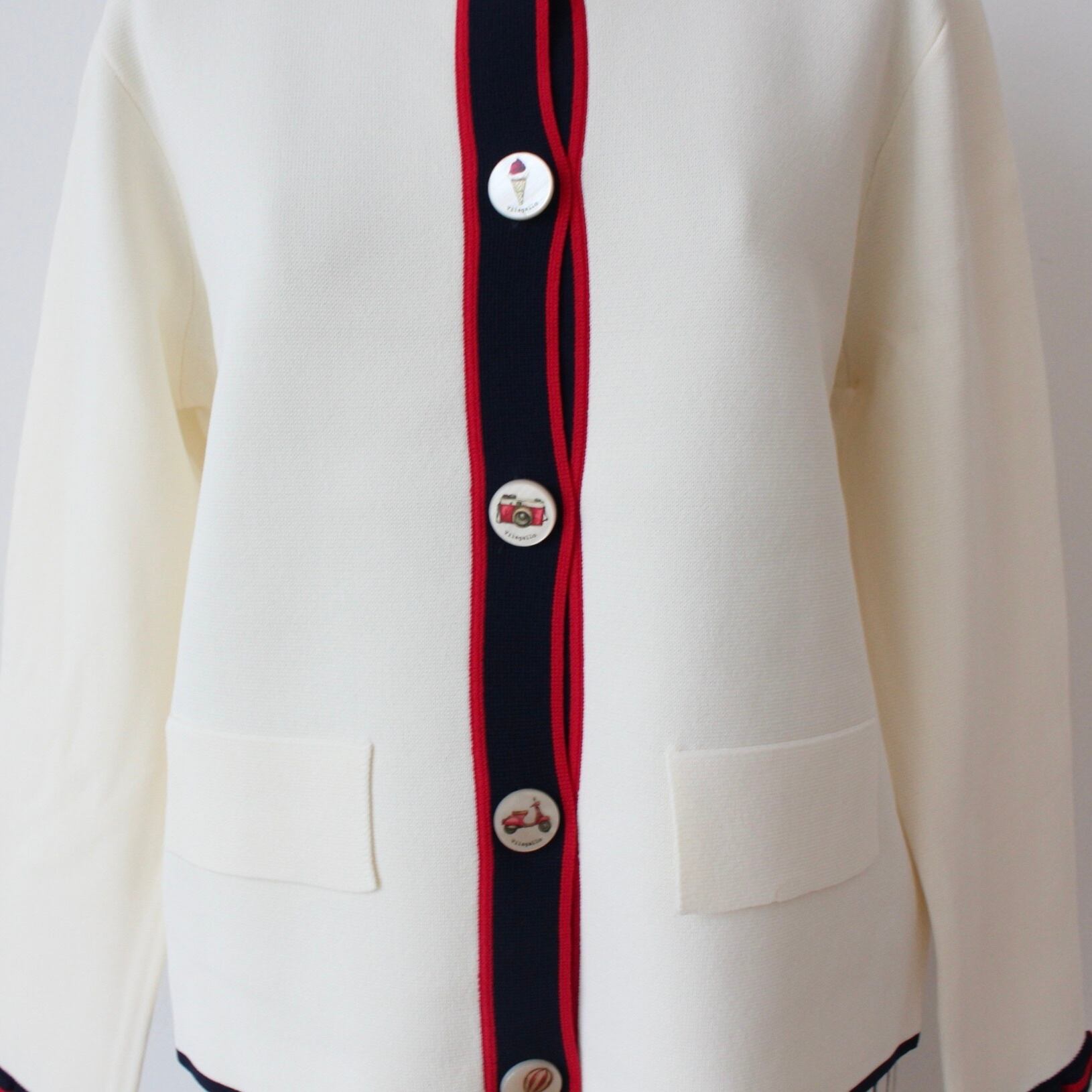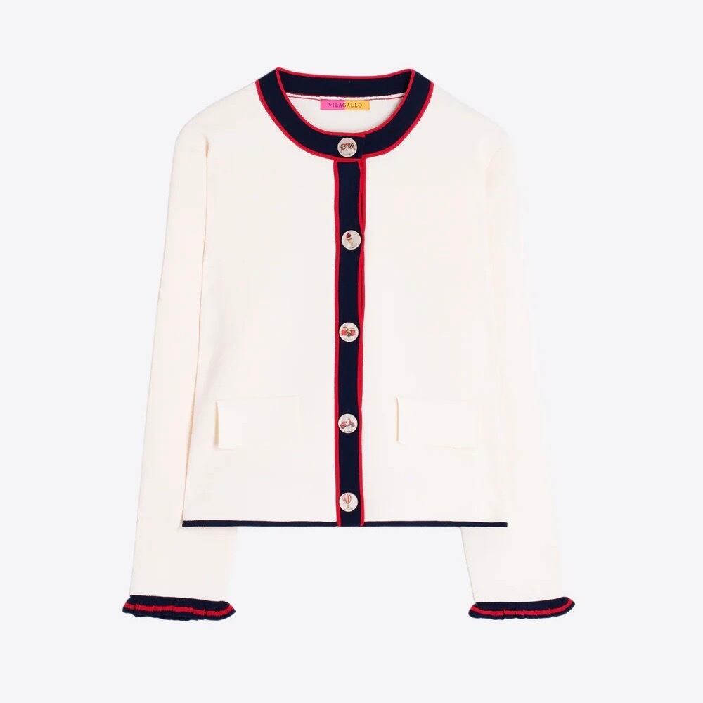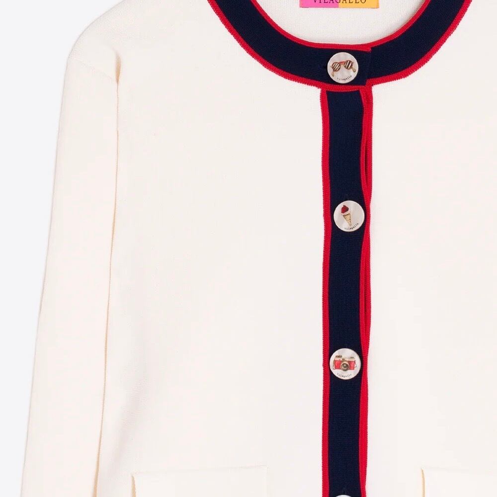 とってもおしゃれで可愛いオススメ**VILAGALLO オフホワイトネイビー✖️レッドトリミングサマーニットカーディガンジャケットは、スペインから届いた洗練されたスタイルの一着です!オフホワイトにネイビーとレッドのトリミングと可愛すぎるボタンが映えるデザインは、カジュアルな日常使いはもちろん、特別なシーンにも映えるアイテムです♪**