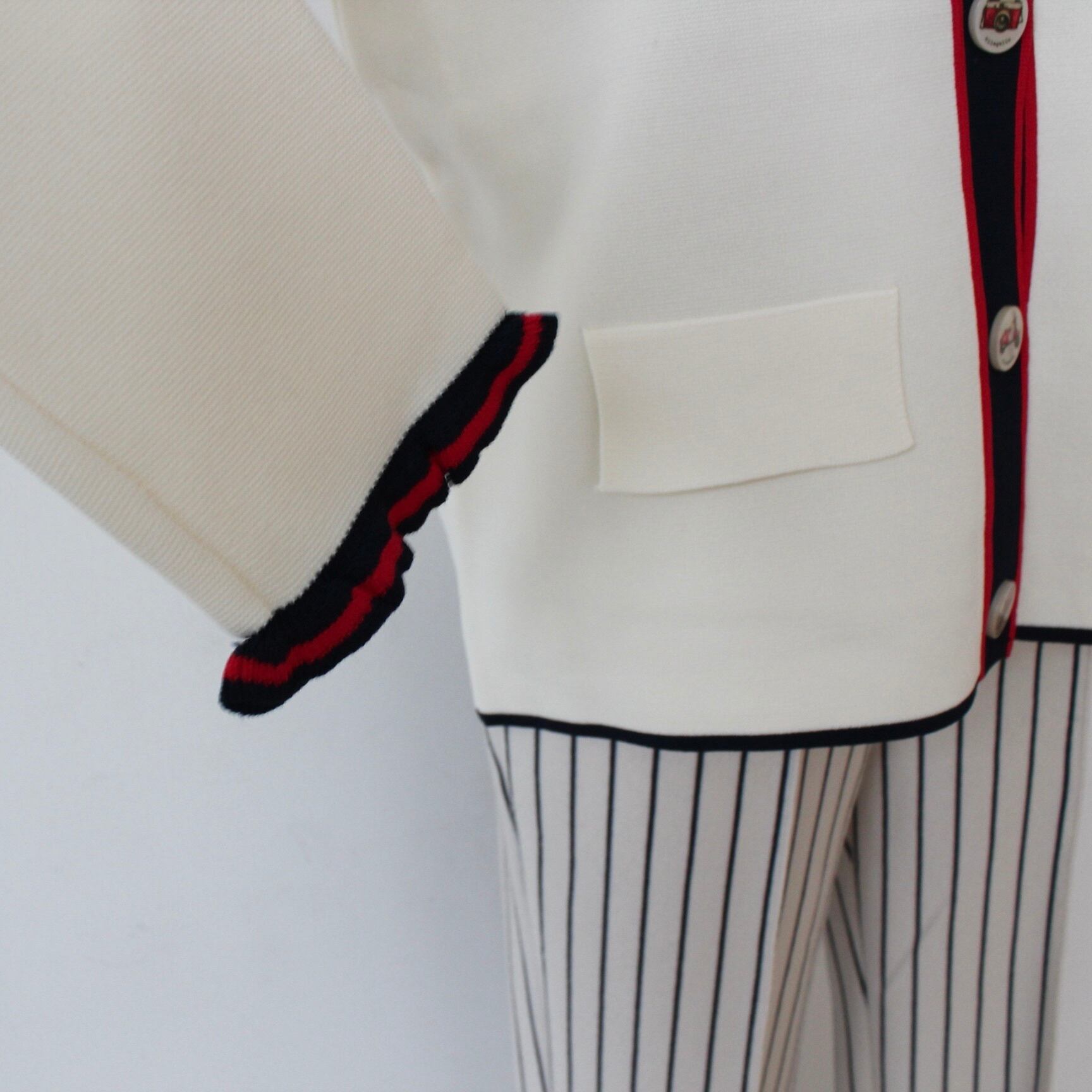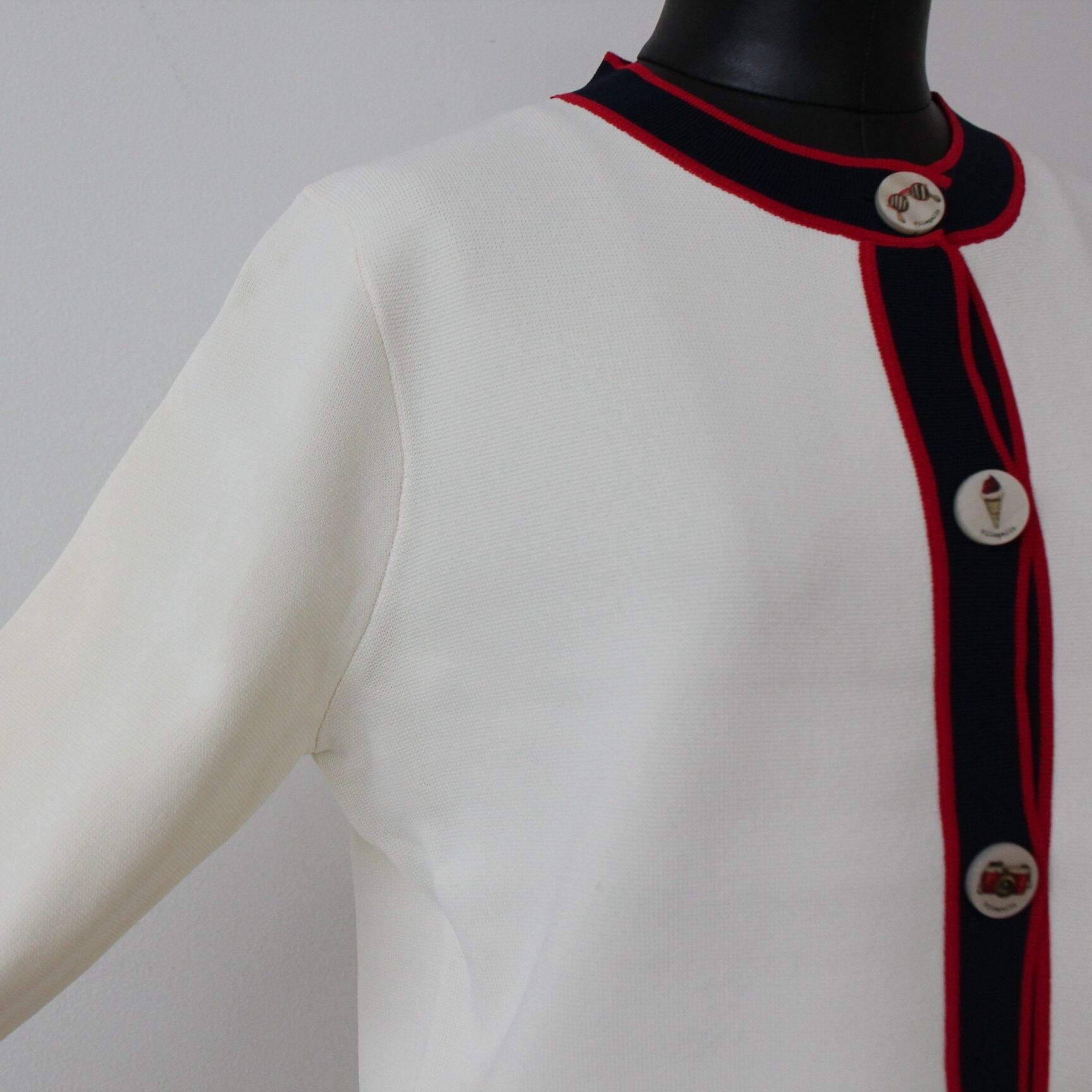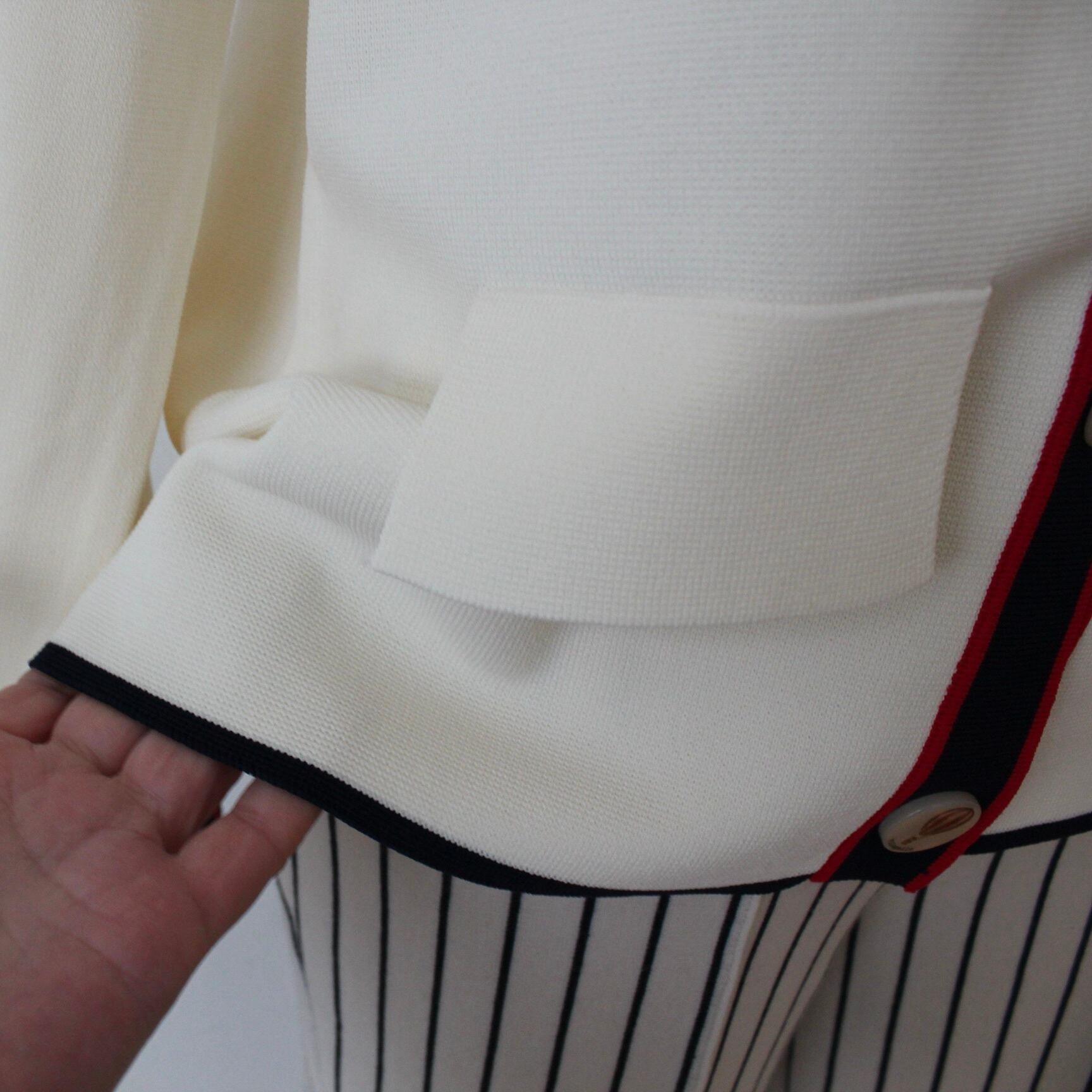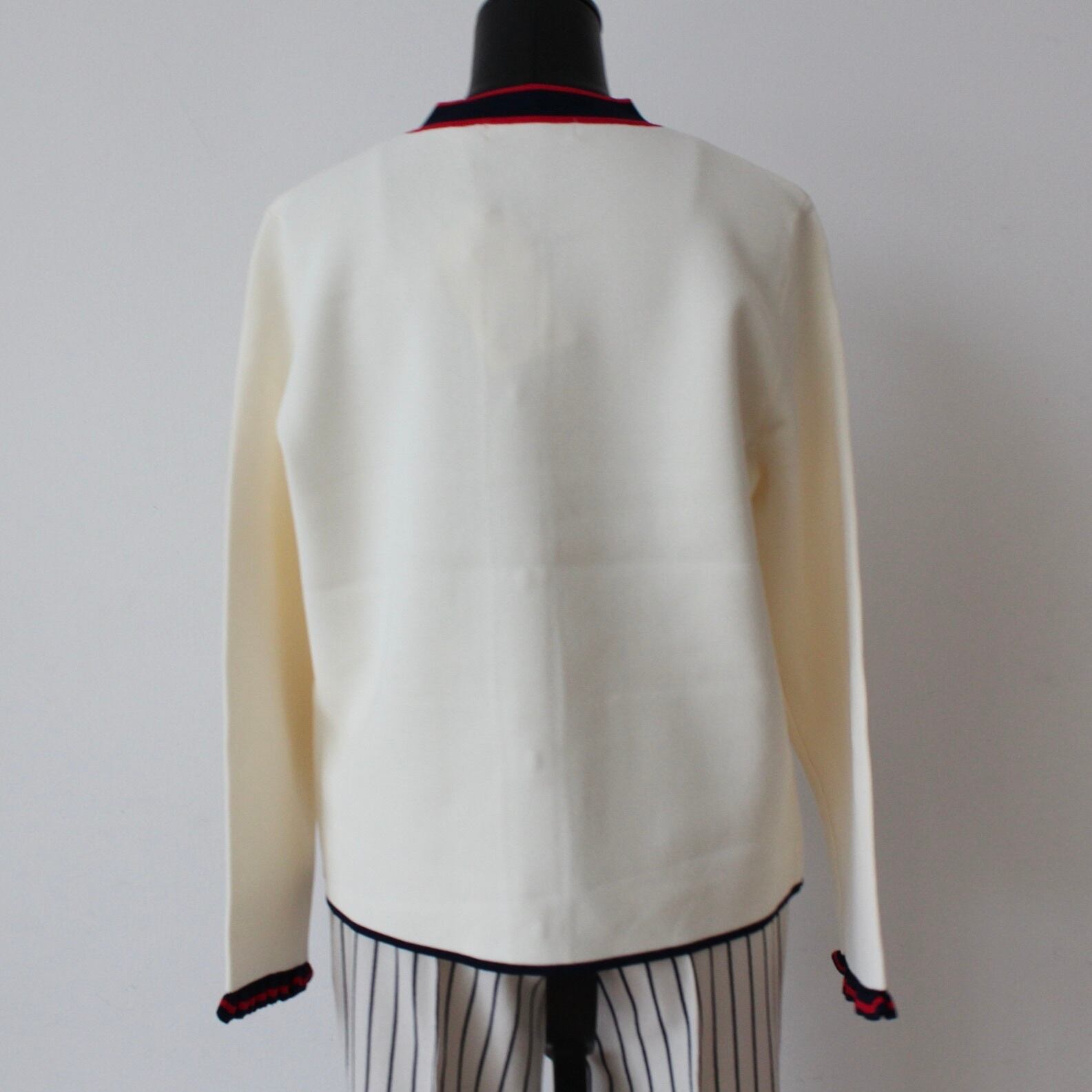 とってもおしゃれで可愛いオススメ**VILAGALLO オフホワイトネイビー✖️レッドトリミングサマーニットカーディガンジャケットは、スペインから届いた洗練されたスタイルの一着です!オフホワイトにネイビーとレッドのトリミングと可愛すぎるボタンが映えるデザインは、カジュアルな日常使いはもちろん、特別なシーンにも映えるアイテムです♪**