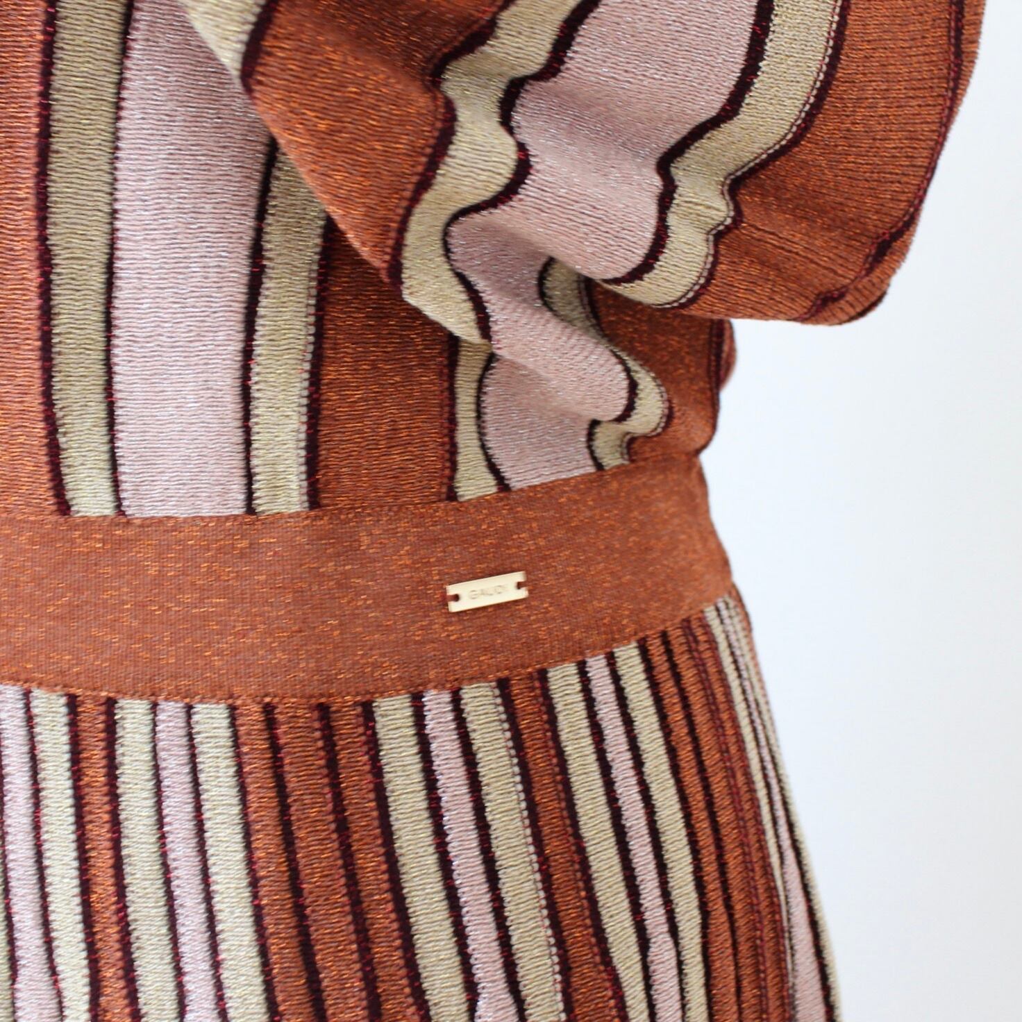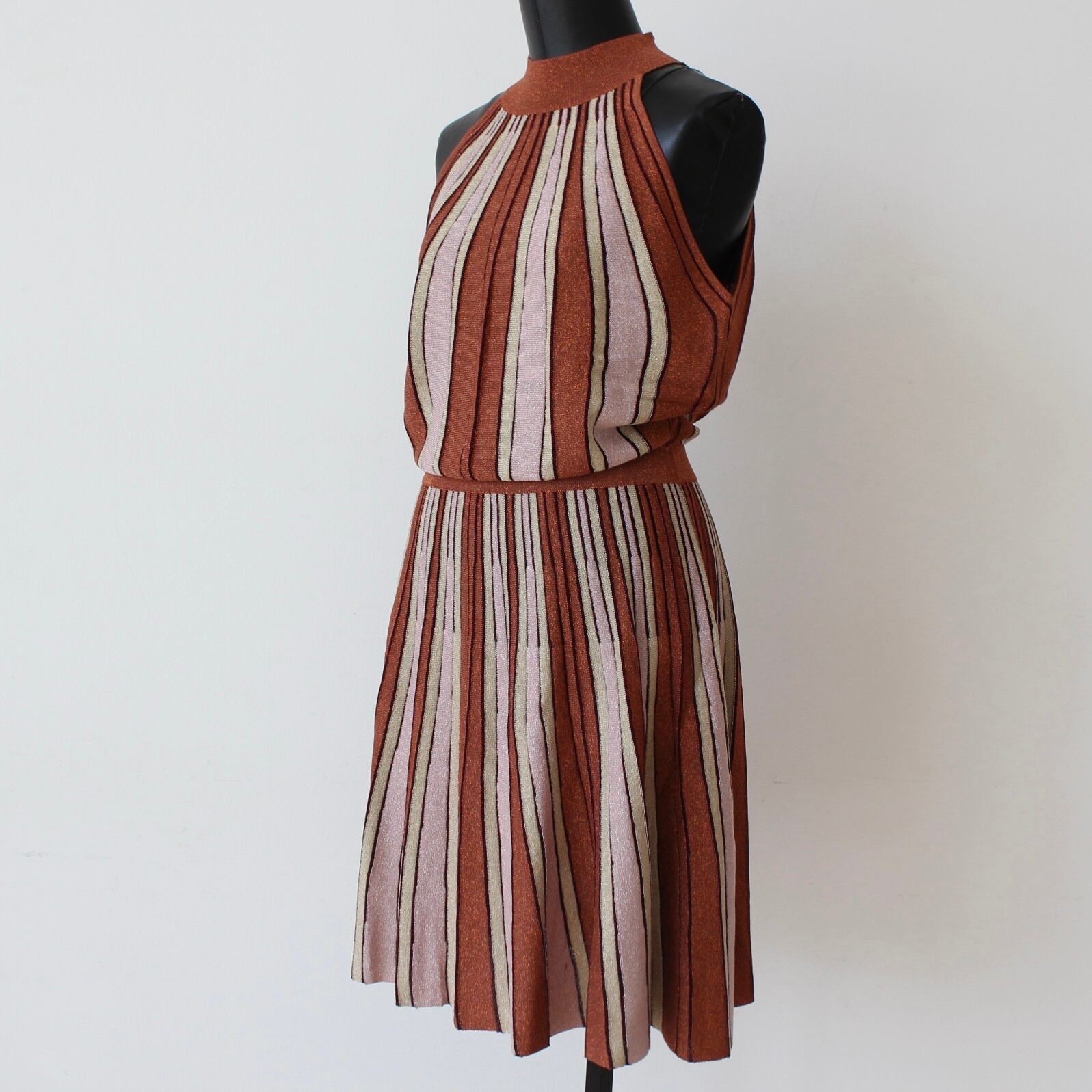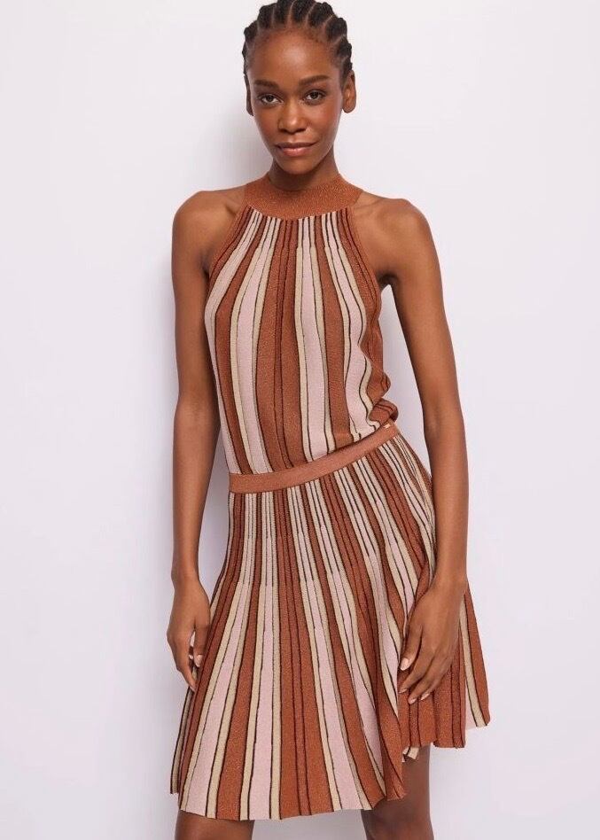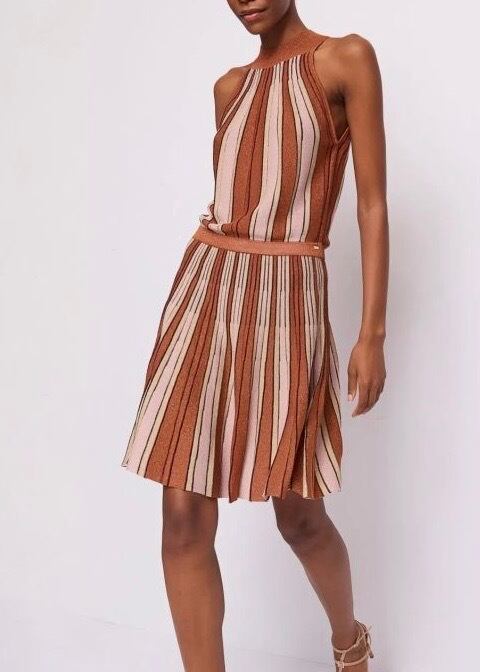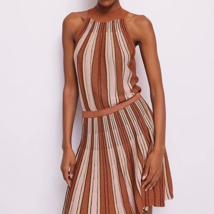 **GAUDI ブラウンラメ入りストライプサマーニットホルターネックワンピースは、イタリアの洗練されたデザインを感じさせる美しいファッションアイテムです!ブラウンにラメを効かせたニットに淡いイエローとピンクをプラスした、ストライプが魅力的に映え、ホルターネックスタイルがセクシーさとエレガントさを融合させた一着です♪ 軽やかで肌触りの良いサマーニット素材を使用しており、快適な着心地が長時間楽しめます。このワンピースは、カジュアルな日常使いから特別なお出かけまで幅広く活躍します。**