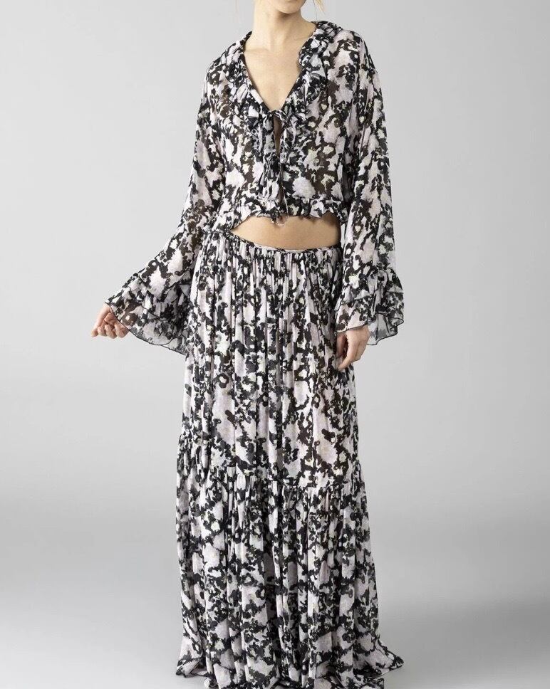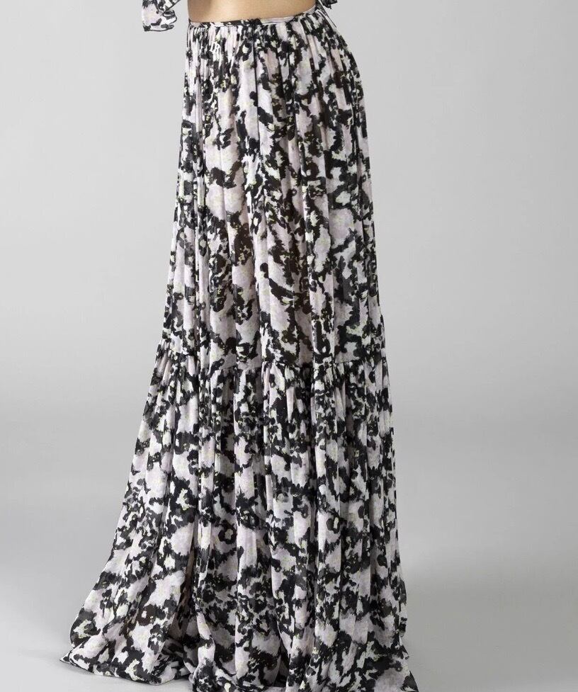 このマキシスカートは、シンプルなトップスやブラウスと合わせることで、デイリーなスタイルから、セットアップのブラウスと合わせることで、デートやパーティーシーンにもピッタリのアレンジが可能です。また、サンダルからスニーカーまで、相性も良く、様々なスタイリングが楽しめます。ぜひ、DENNY ROSE ブラックシフォンピンク✖️グリーンフラワーマキシティアードスカートで、あなたのファッションスタイルを一層引き立ててください!