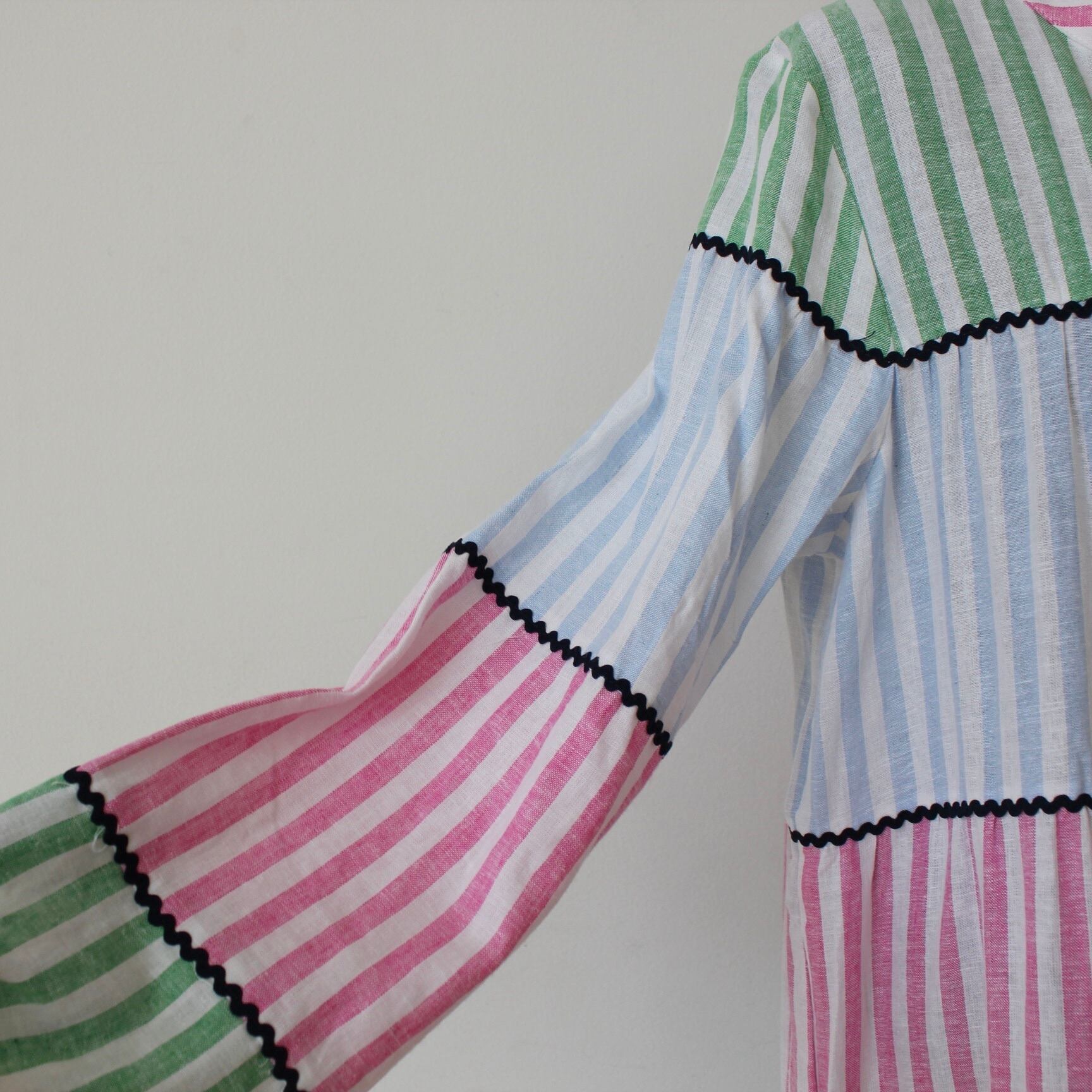 **VILAGALLO リネンマルチカラーストライプティアードネイビーのグランリボンポイントマキシワンピースは、スペイン製の華やかなデザインが魅力のアイテムです!リネン素材を使用したマルチカラーストライプは、軽やかさと涼しさを兼ね備え、夏の日差しの中でも快適に過ごせます♪ ティアードデザインと黒のグランリボンが、ラグジュアリーなエレガントさを一層引き立て、特別なシーンからデイリーまで幅広くご使用いただけます。**