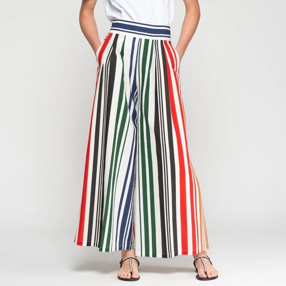 **VILAGALLO マルチカラーストライプワイドコットンパンツは、スペイン製の上質な爽やかサッカーコットン素材を使用した、暑い夏でも快適でワイドなデザインがスタイリッシュなパンツです!カラフルなストライプデザインが目を引き、ワイドシルエットはリラックス感を演出しながらも、洗練された印象を与えます♪ 軽やかな着心地は、デイリーから特別なシーンまで幅広く活躍する一着です。**