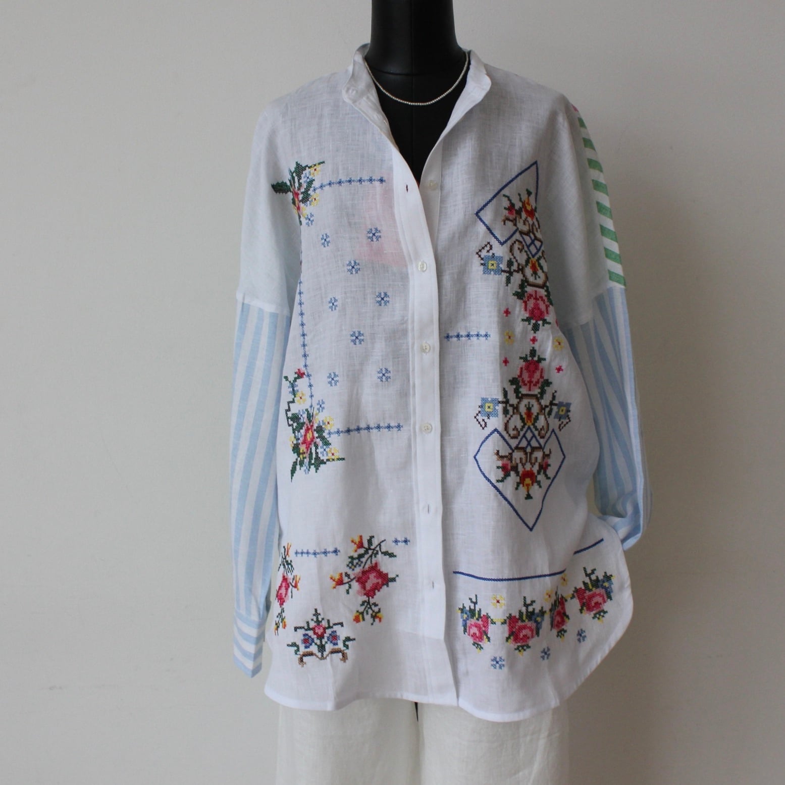 このブラウスは、パンツやスカート、デニムパンツと合わせることで、多彩なスタイリングが楽しめます。また、ジャケットやカーディガンとのレイヤリングで、季節の変わり目にもぴったりのコーディネートを実現します。VILAGALLO ホワイト刺繍✖️マルチカラーストライプポイントスタンドリネンシャツブラウスで、あなたのワードローブに新たなエレガンスを加えてみてはいかがでしょうか!