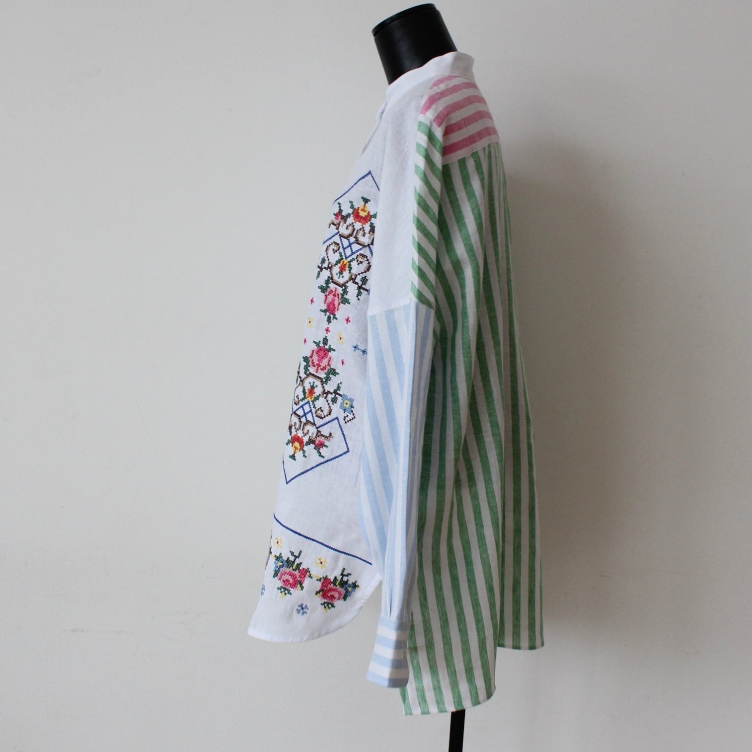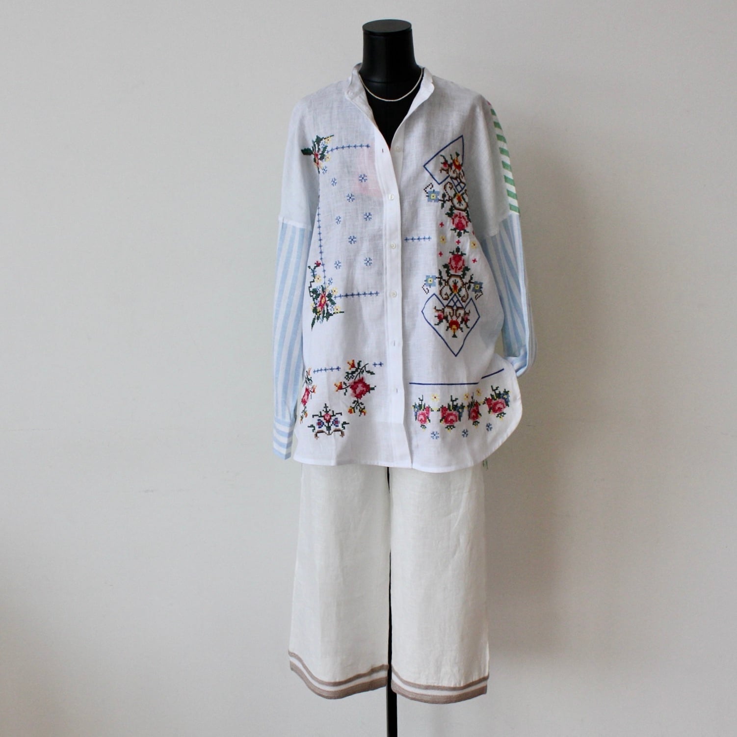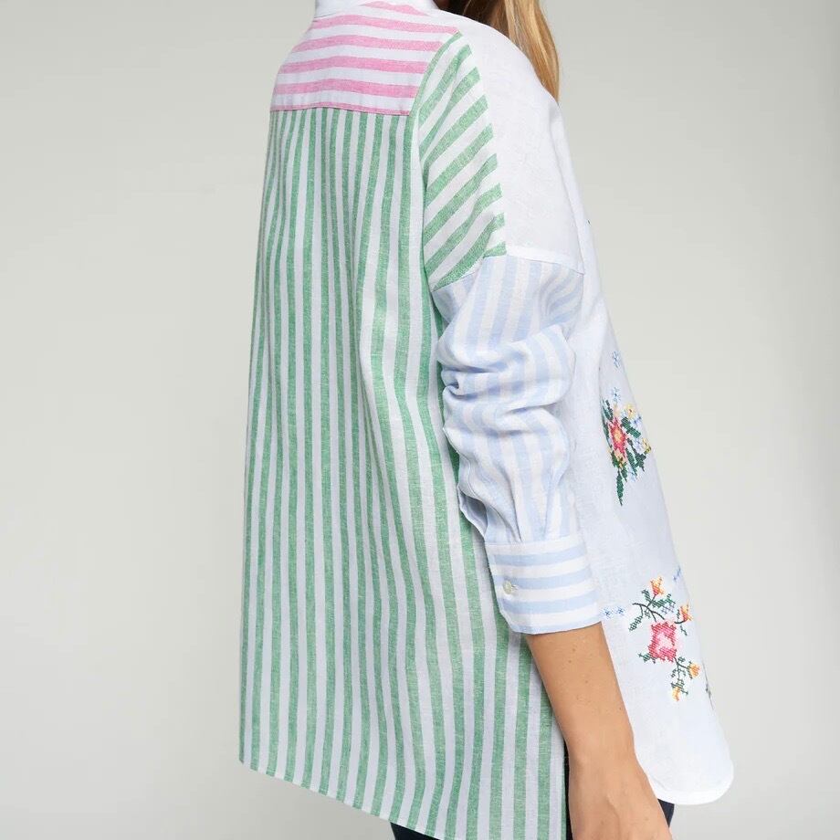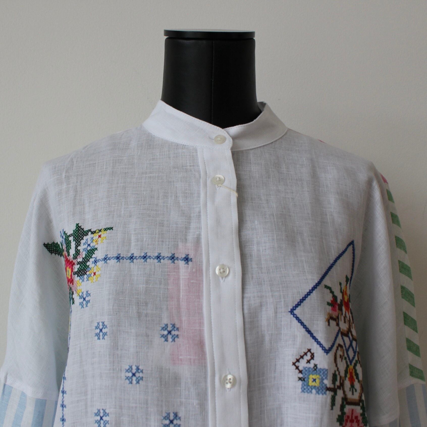 VILAGALLO ホワイト刺繍✖️マルチカラーストライプポイントスタンドリネンシャツブラウス SPAIN:VIL33214 ¥36,000+tax