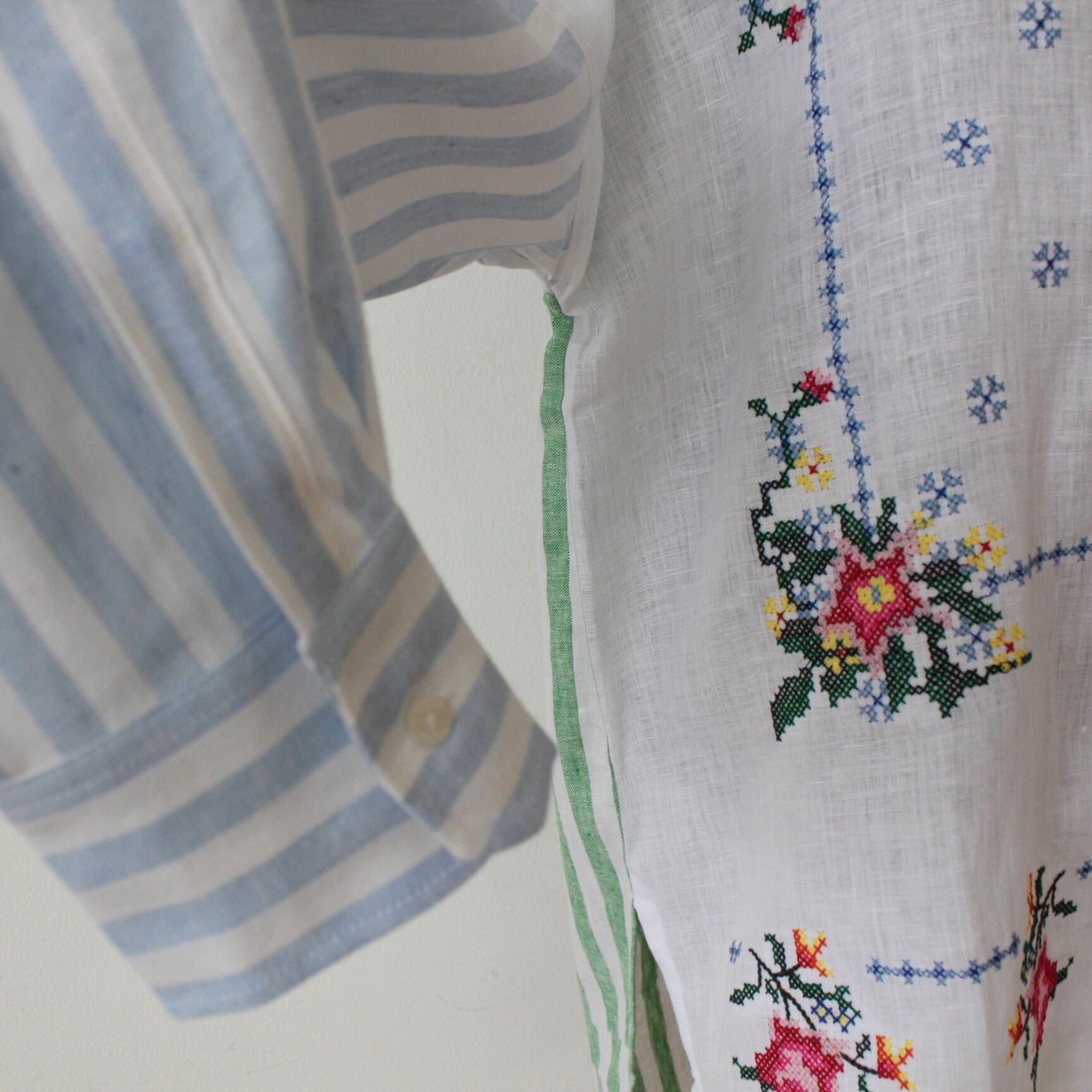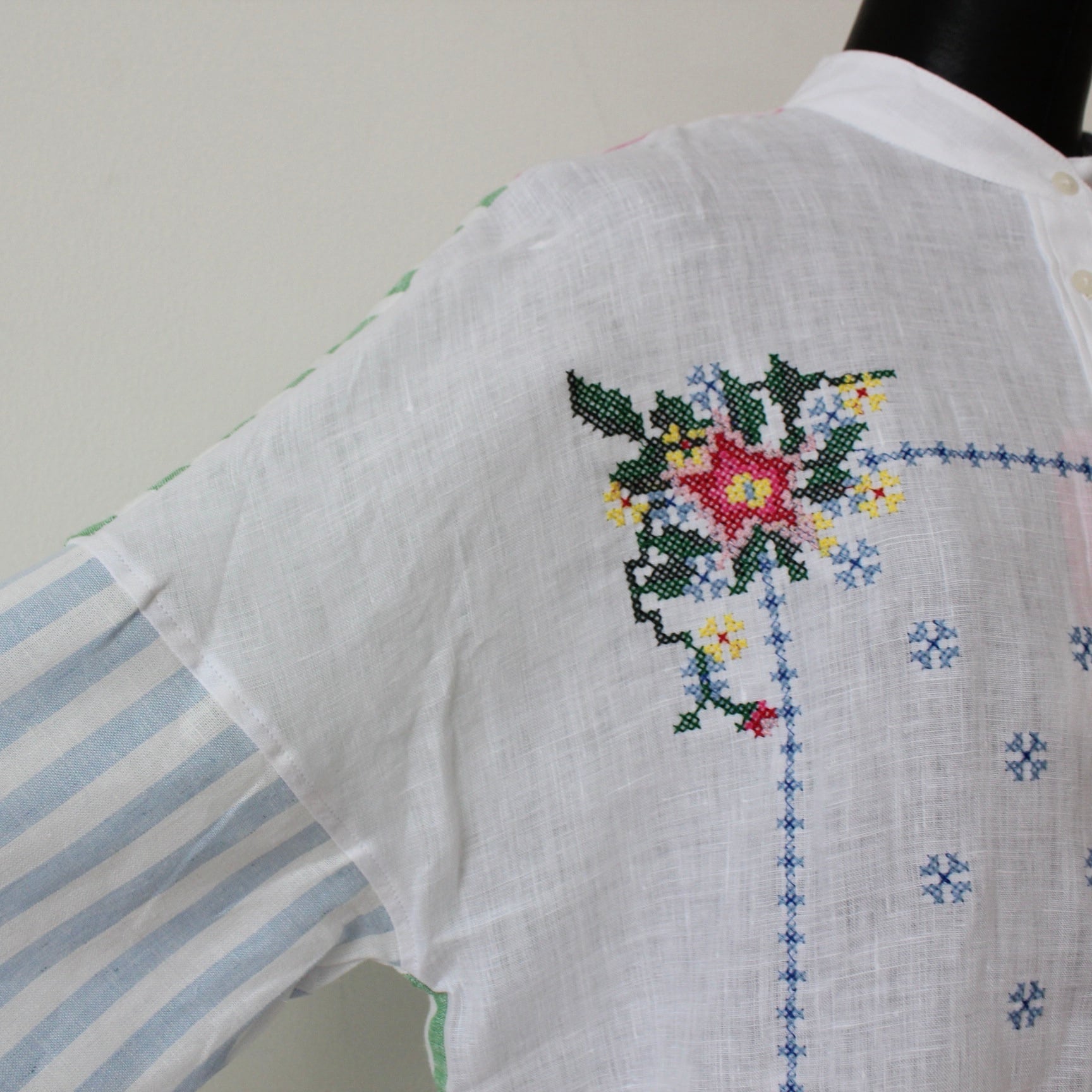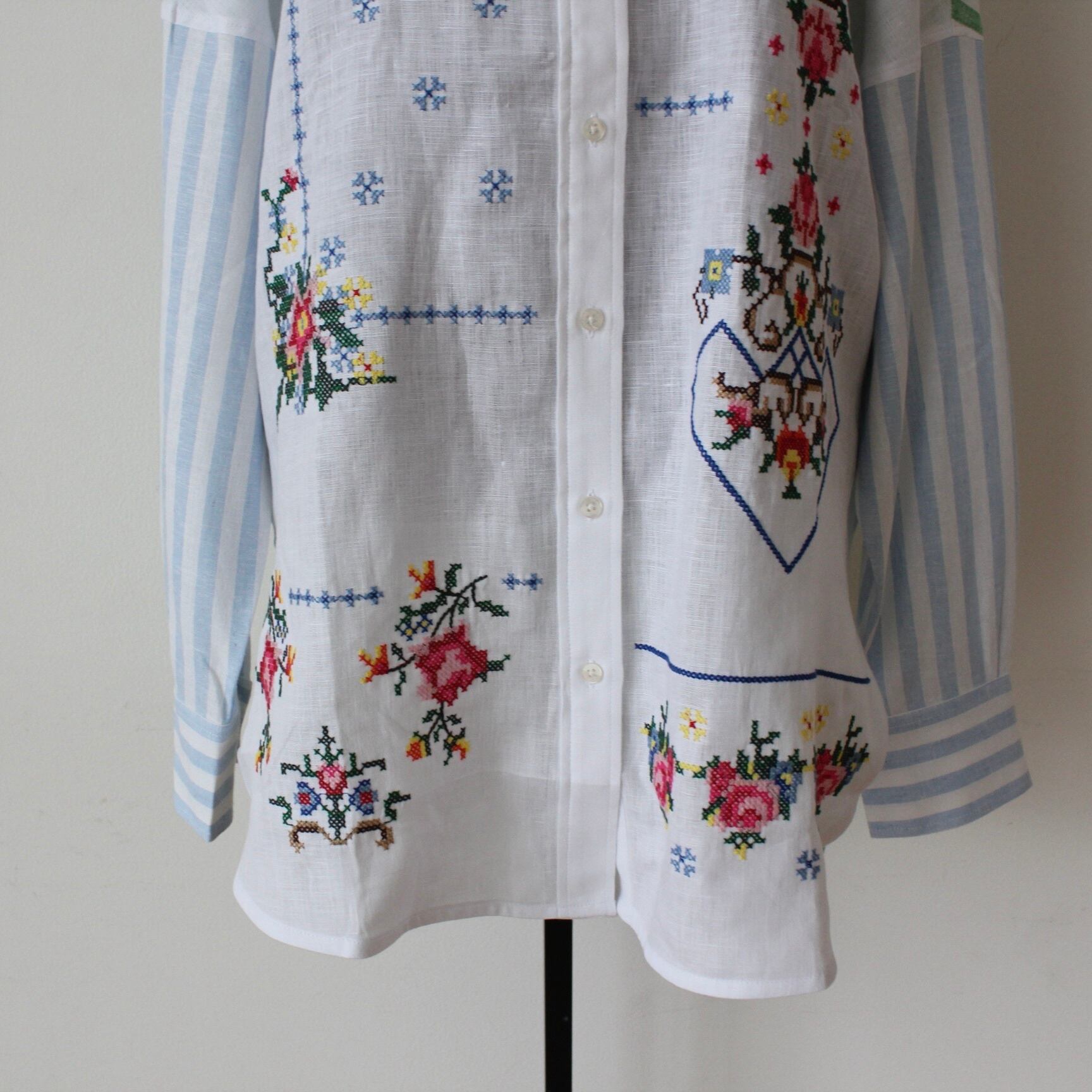 **VILAGALLO ホワイト刺繍✖️マルチカラーストライプポイントスタンドリネンシャツブラウスは、スペイン製の高品質なリネン素材を使用した、洗練されたデザインのブラウスです!ホワイトの麻素材に上品でカラフルなクロス刺繍がさりげなく添えられ、バックとお袖はストライプが目を引く魅力的な一着です♪ 軽やかなリネン素材は、涼しさを感じさせつつも、着心地も抜群で、デイリーから特別なシーンまで幅広くお使いいただけます。**