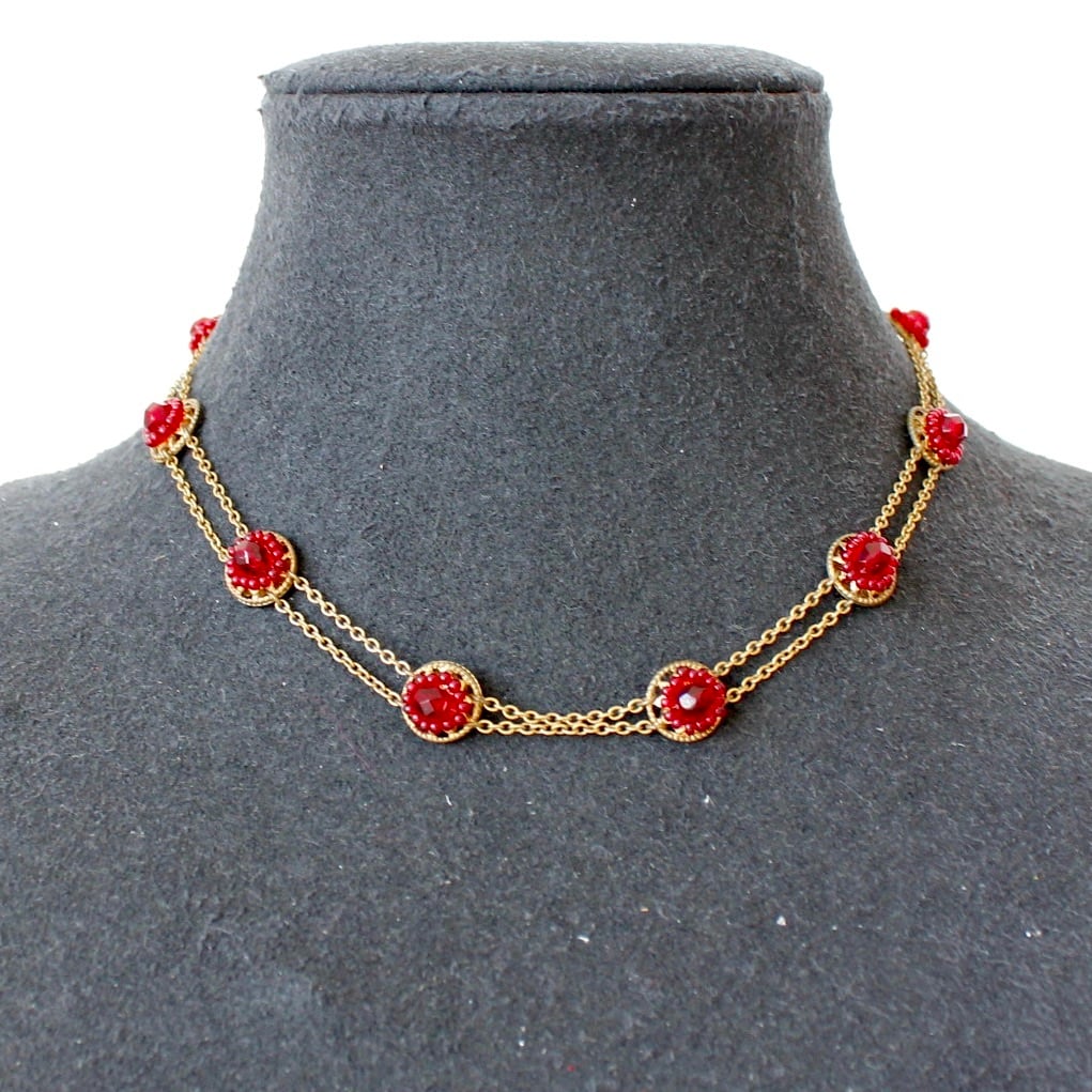 レッドカラーのビーズでお花のような立体的なモチーフが施されたネックレス。