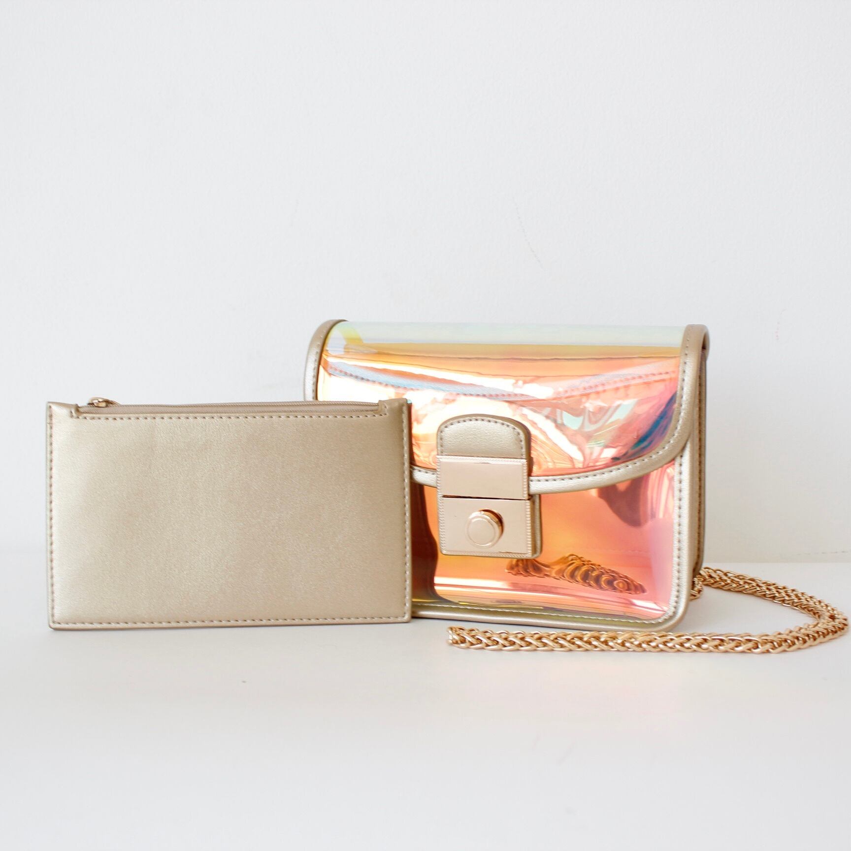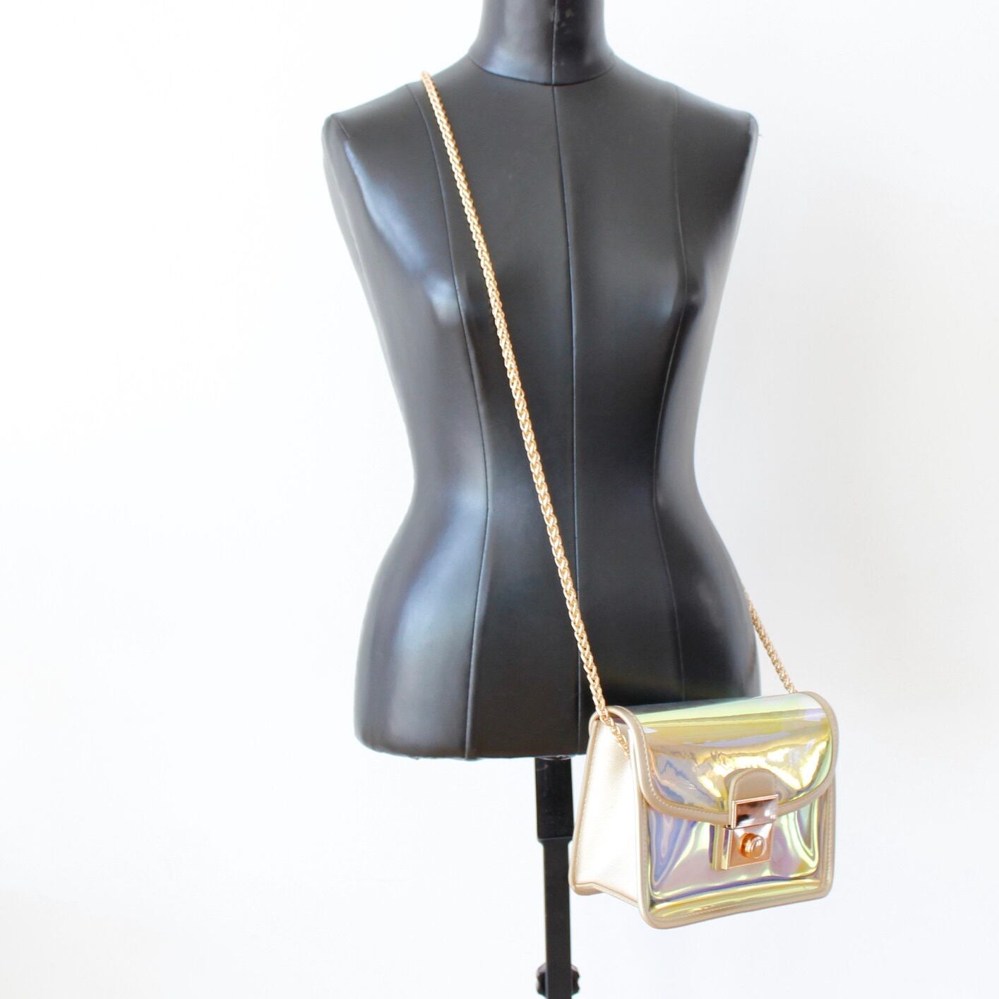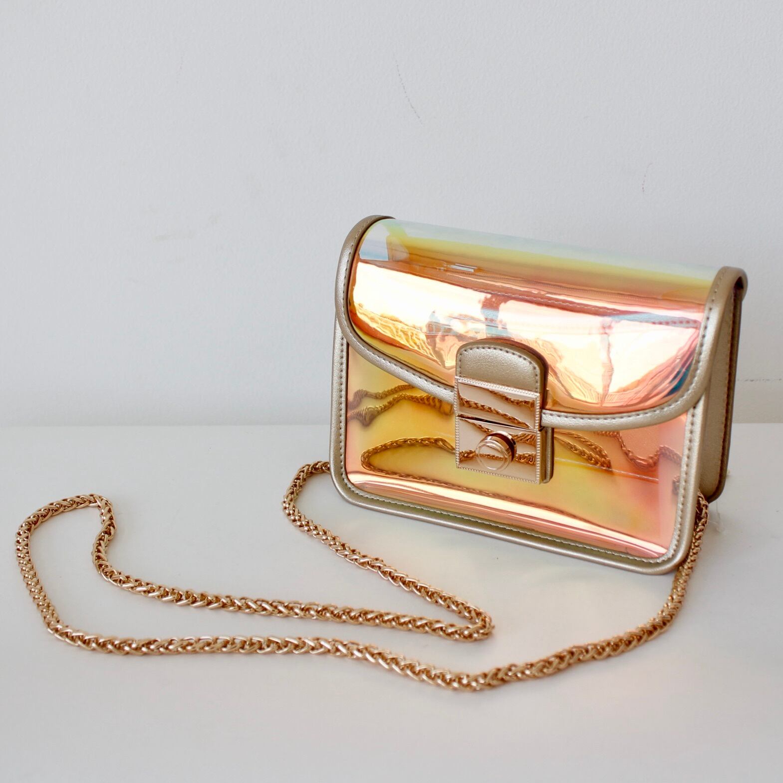 今年の人気カラー、オーロラカラーでトレンドも抑えたバッグは、ゴールドチェーンで大人っぽい印象に仕上げました。