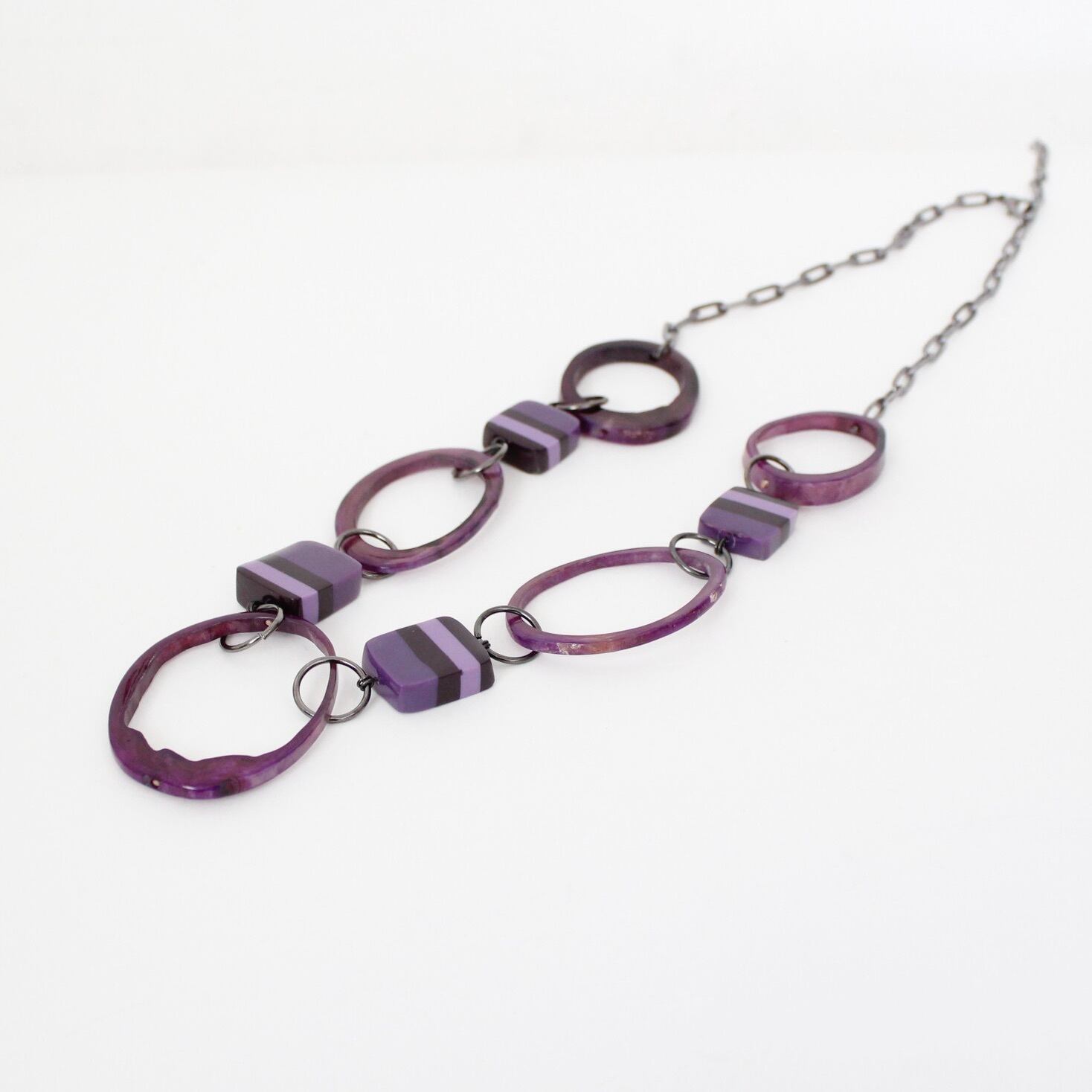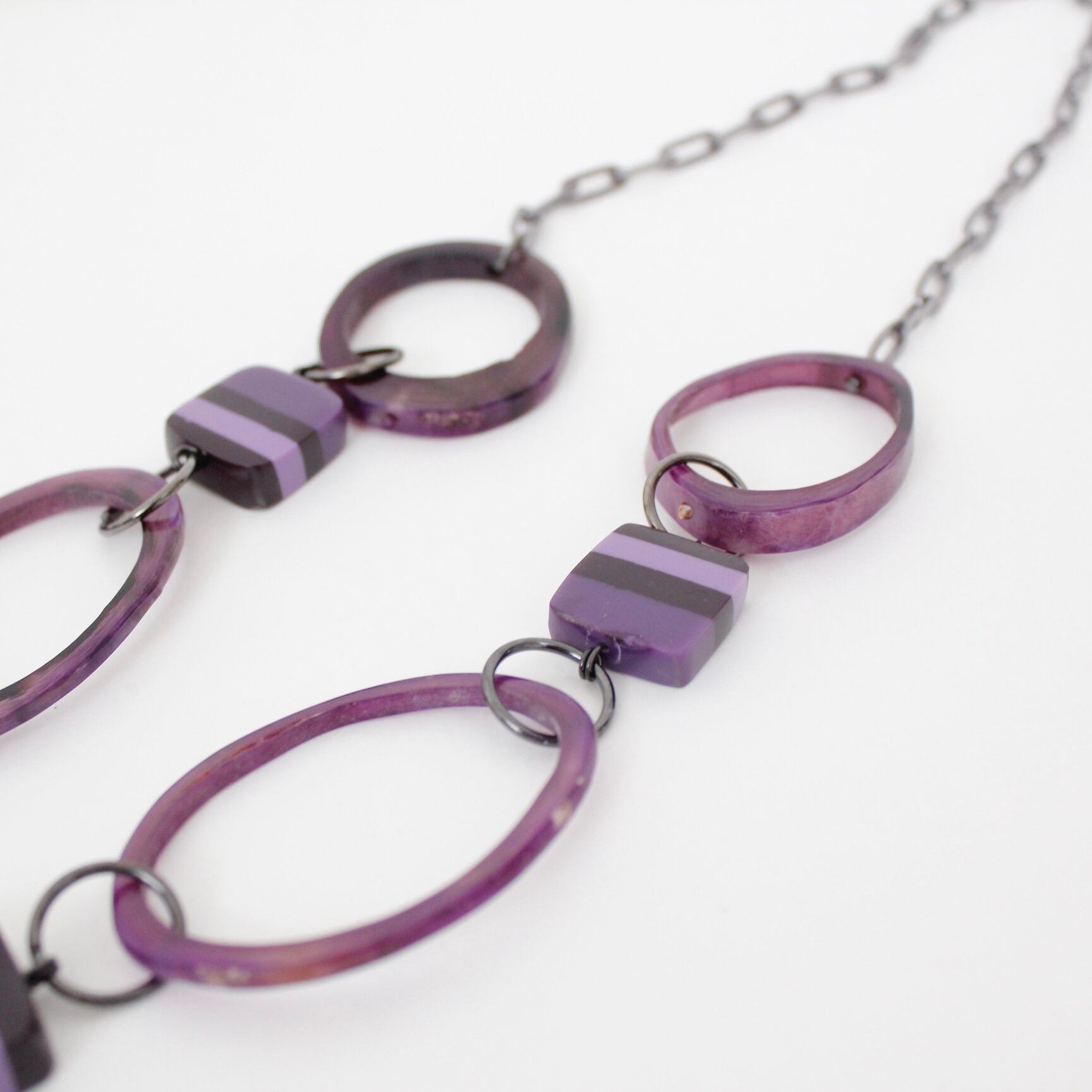 独特なデザインのパープルカラーのプラスチックパーツを組み合わせたロングネックレス。