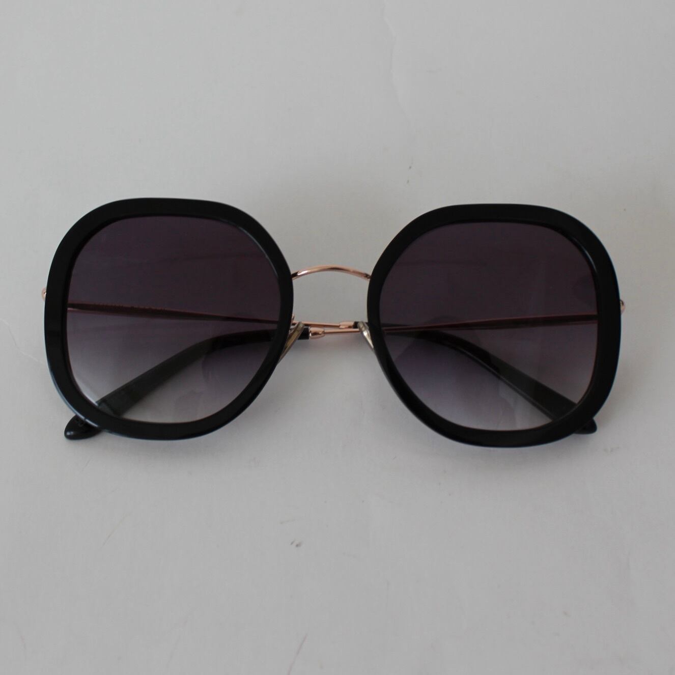 レンズのカラーはグレーグラデーションでシンプルに、フレームはオールブラックのスクエアーで存在感があります。