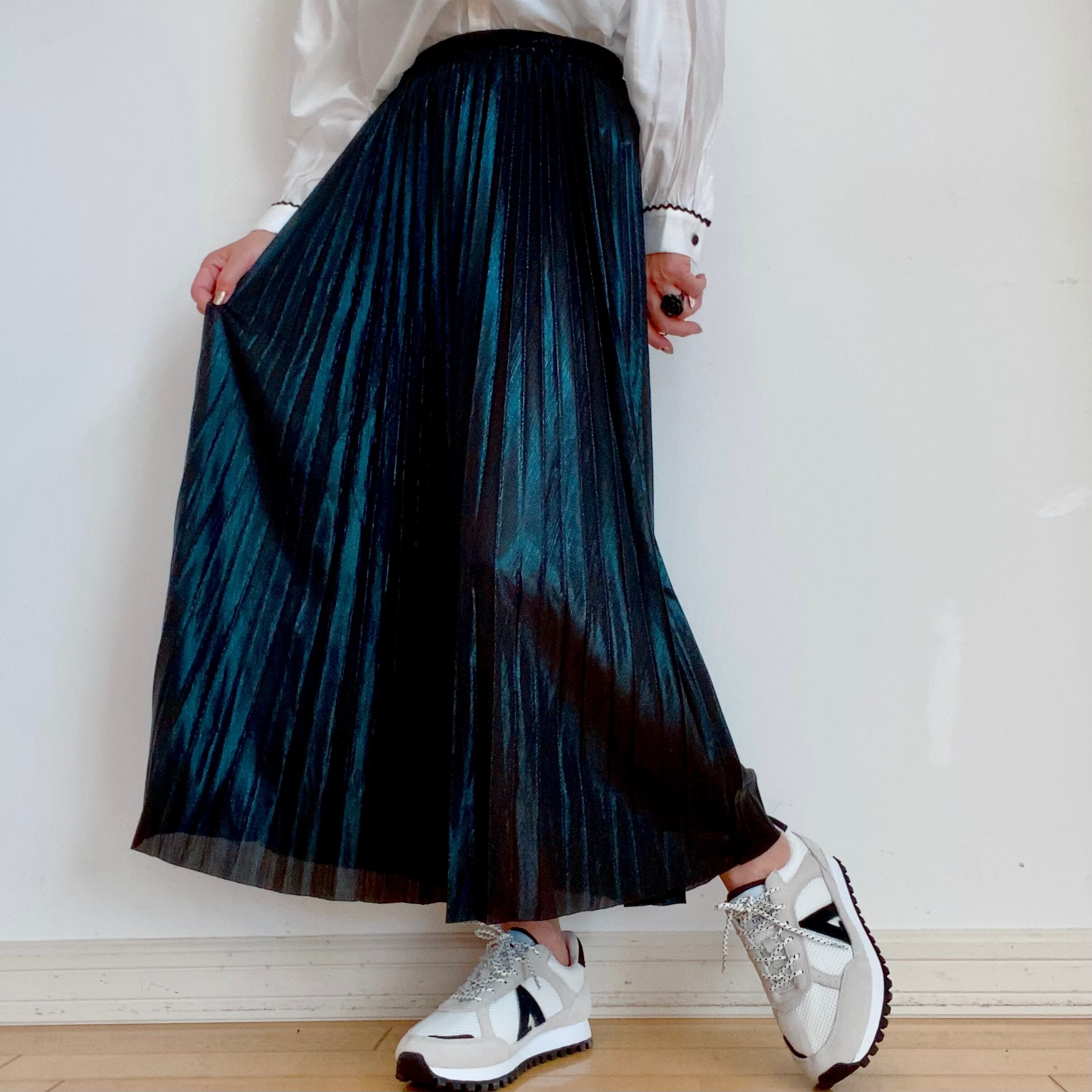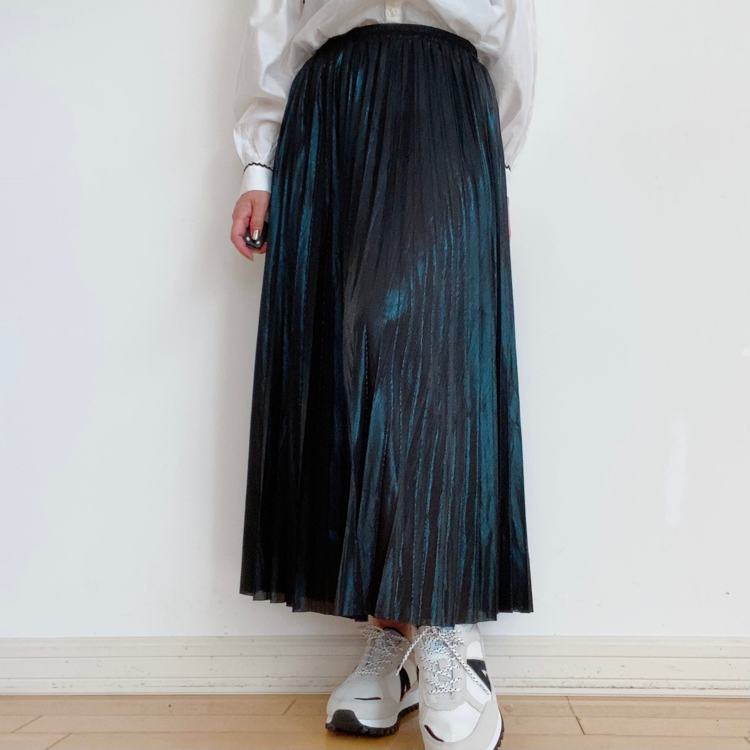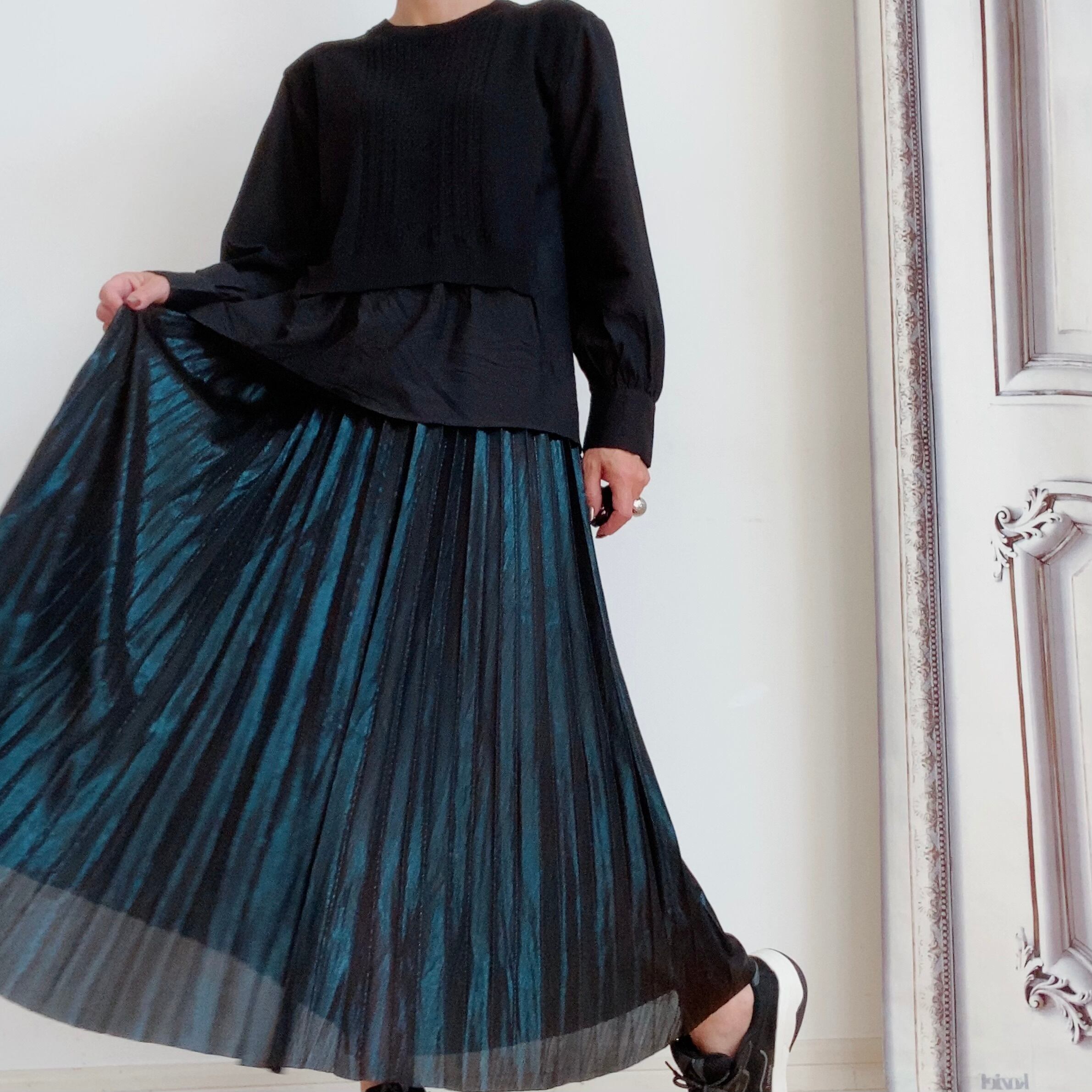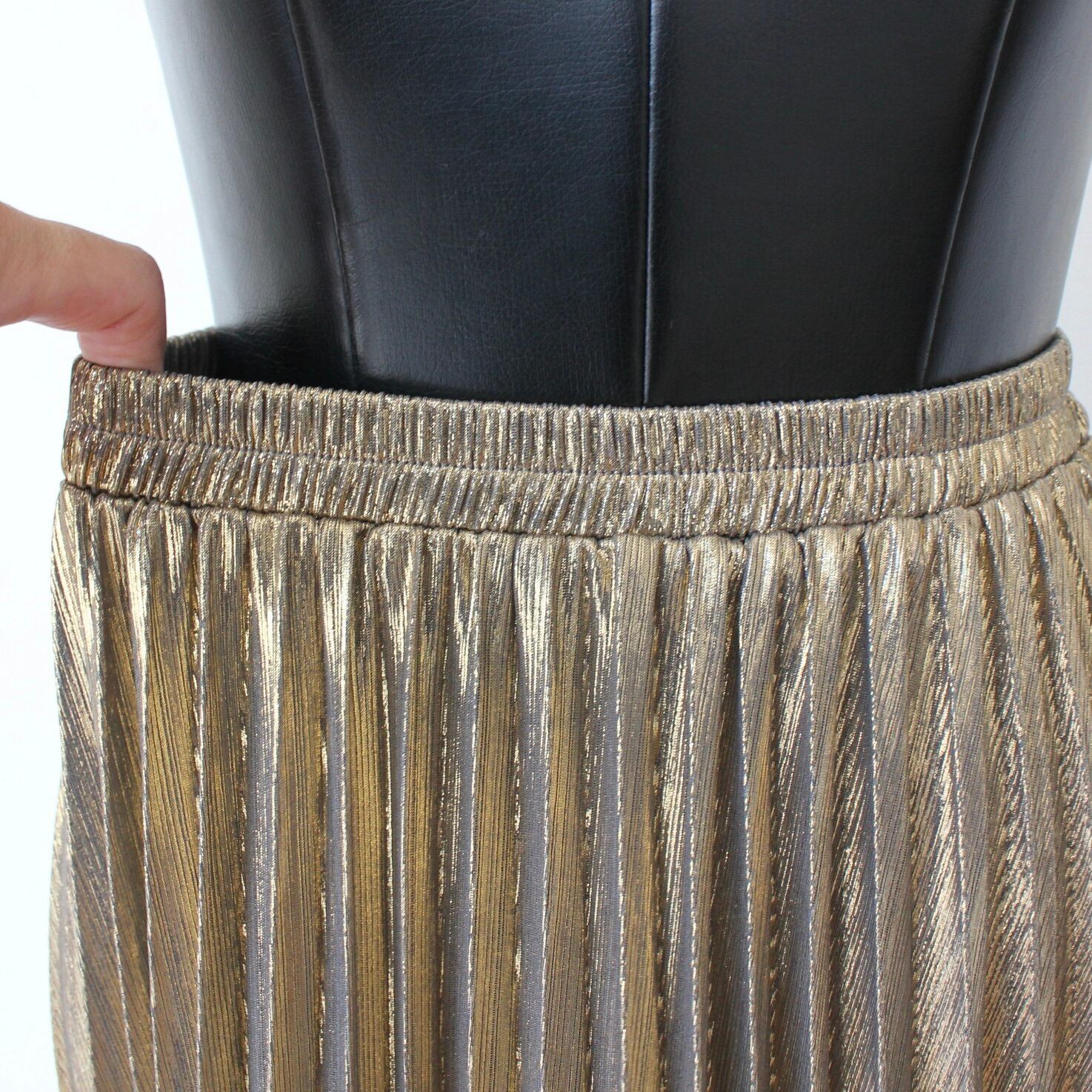 今季注目のメタリック素材ブラック&ゴールドプリーツスカート。