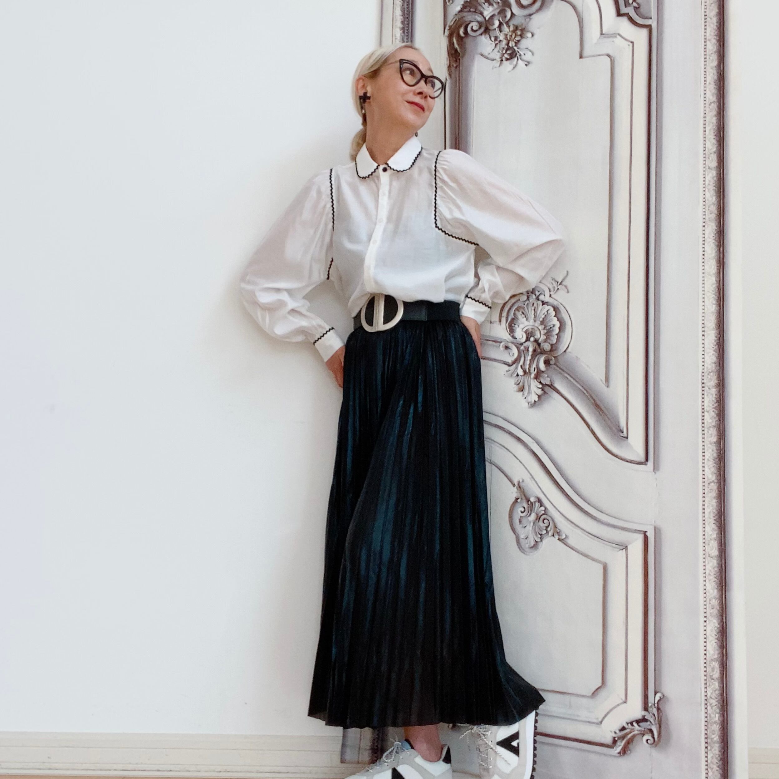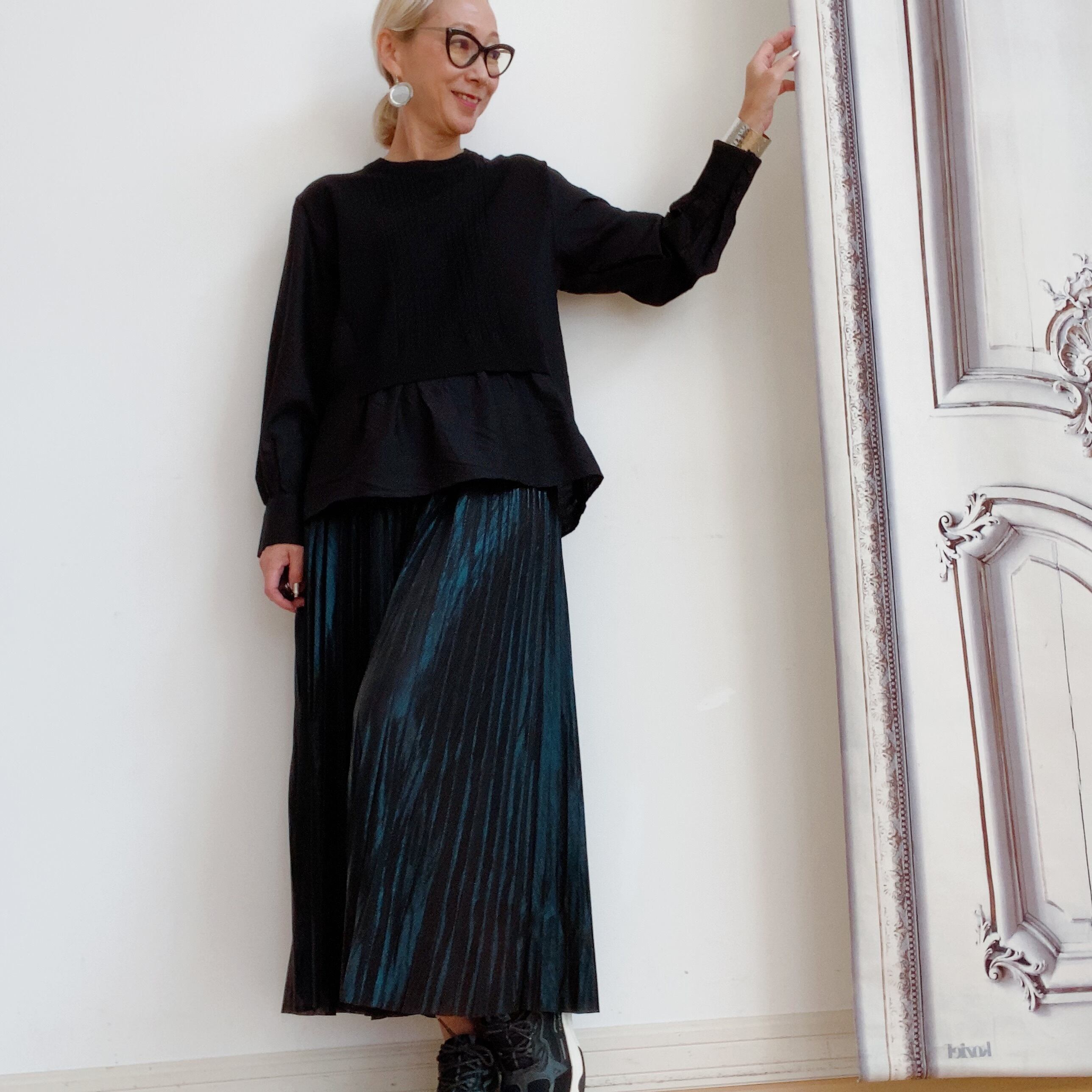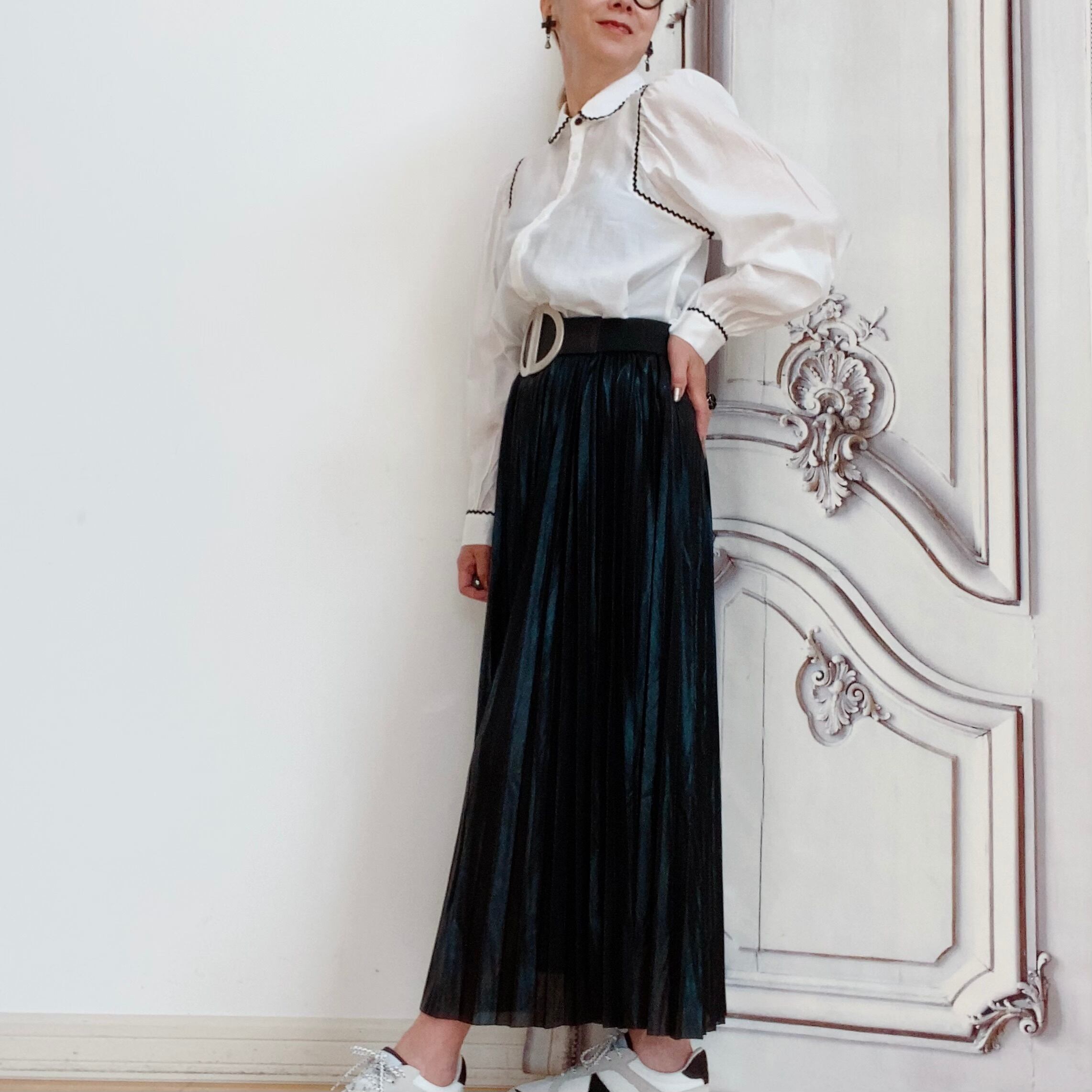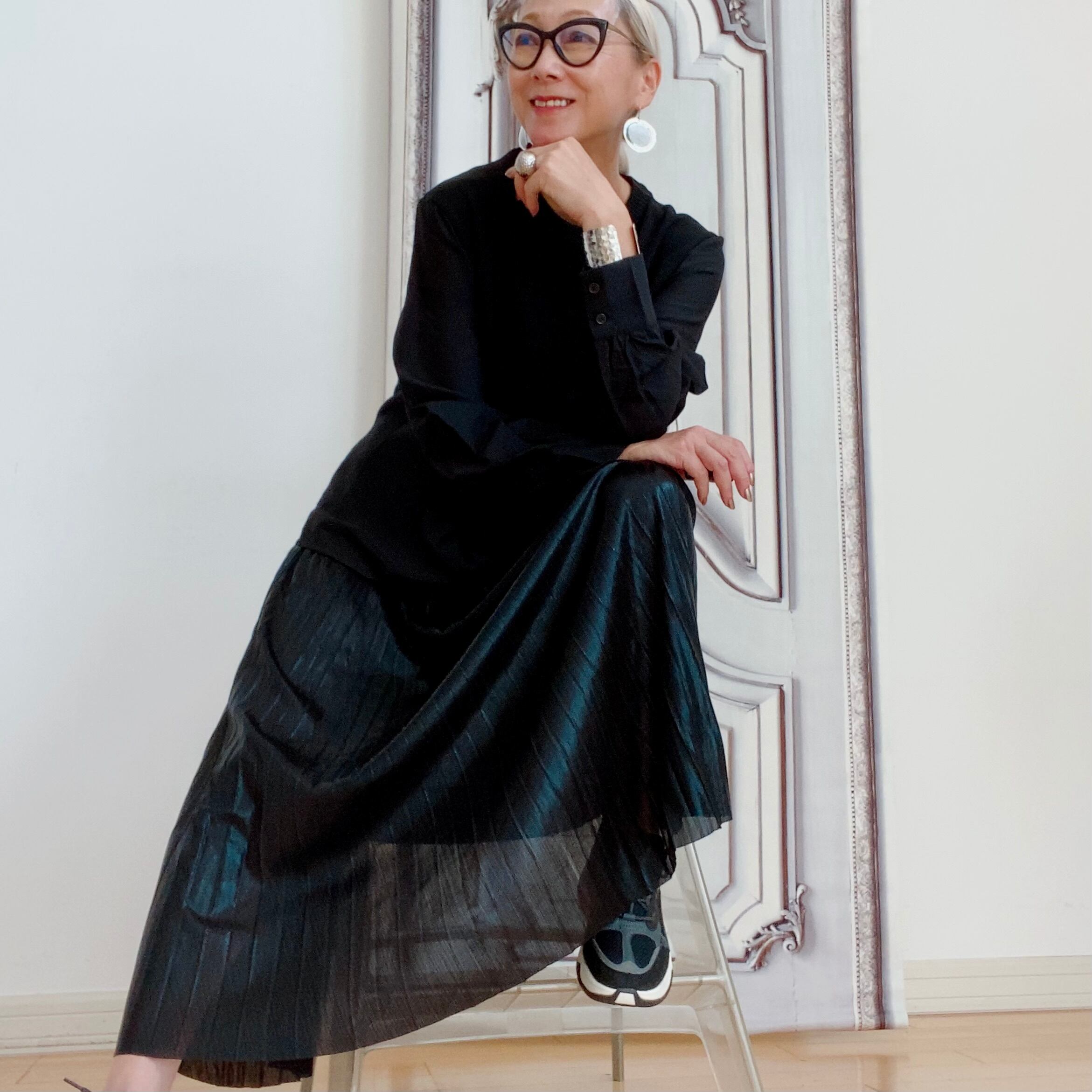 今季注目のメタリック素材ブラック&ゴールドプリーツスカート。