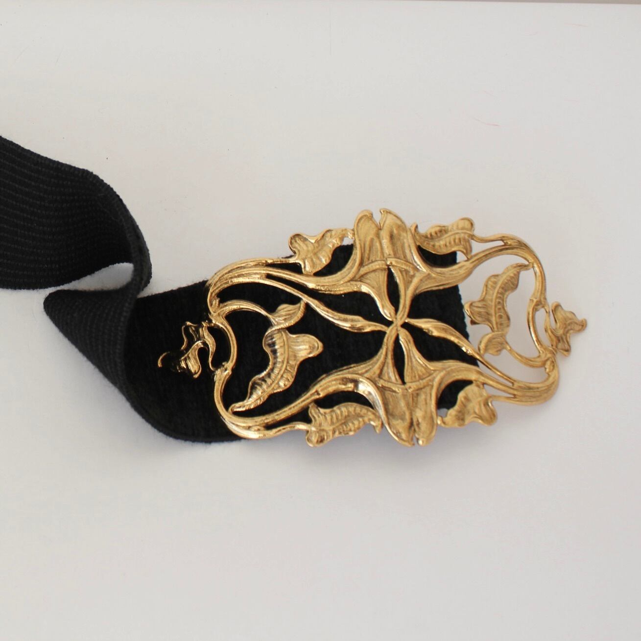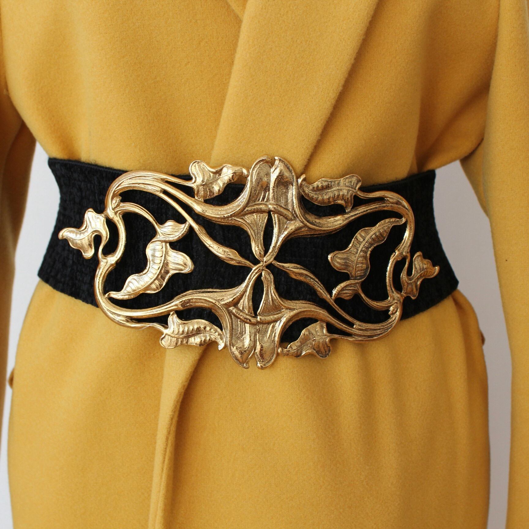 フランスのオペラ座が思い浮かぶ、エレガントでゴージャスなゴールドの大きなバックルがアクセントになったウエストマークが主役になる存在感抜群のゴムベルト見つけました!