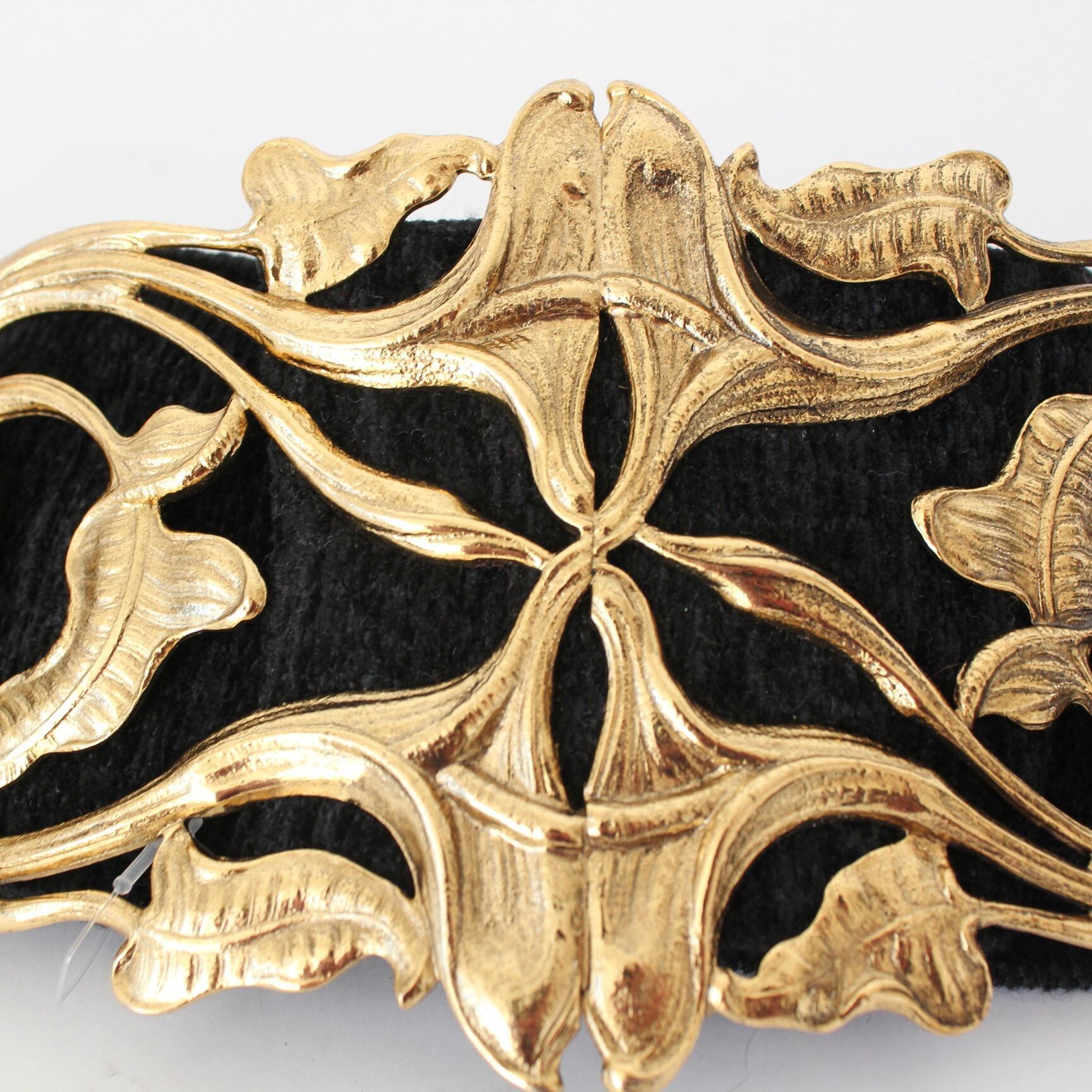 ゴールドのゴージャスなレリーフのバングルがとっても素敵で、どんなお洋服に合わせても、エレガントで、ゴージャスなイメージに。横幅が広く、丁度ウエストの幅に見せる事が出来、貴方のウエストも細く見せてくれます。太めのマットなベロアゴムで、ゴールドのバングルを引き立ててくれ、薄手のブラウスやワンピースから、コートまでどんなアイテムにも自由に合わせる事が出来て愛用間違えなし。