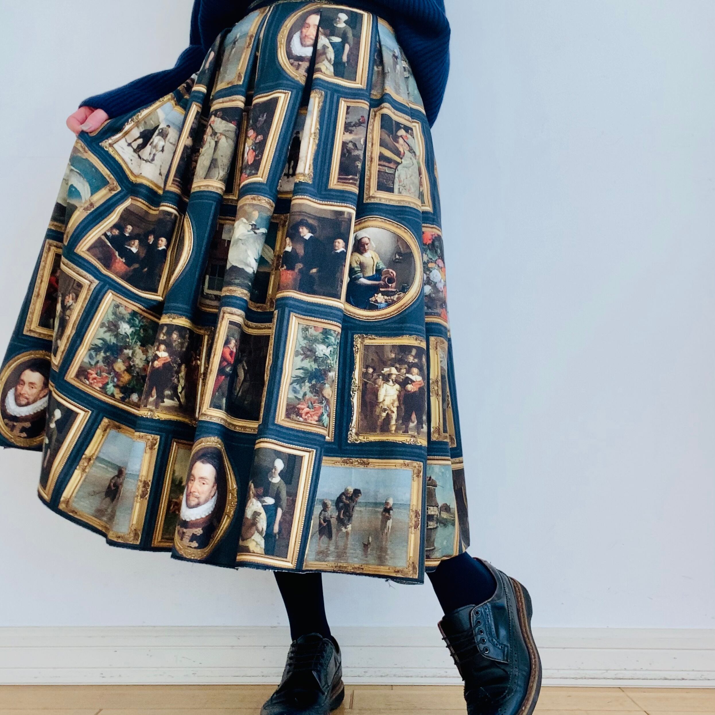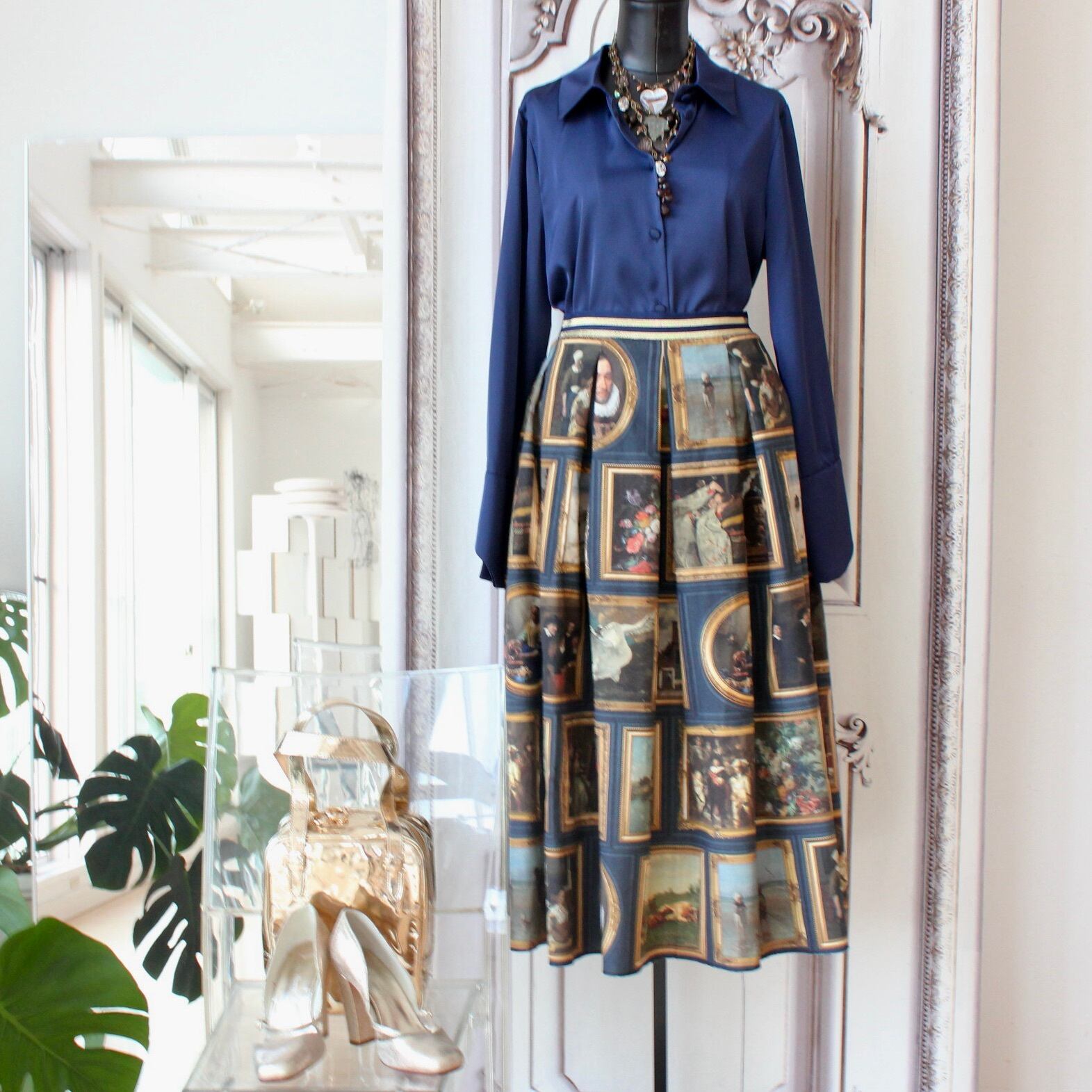 78オリジナルフランス素材絵画プリントタックフレアースカートは、高品質なフランス素材を使用し、プリントには絵画アートが施されたスカート。美しいデザインと流れるようなフレアースカートのシルエットが、女性らしさを引き立てます。トップスを変える事で、エレガントな場でもカジュアルな場でも活躍する万能アイテムです。