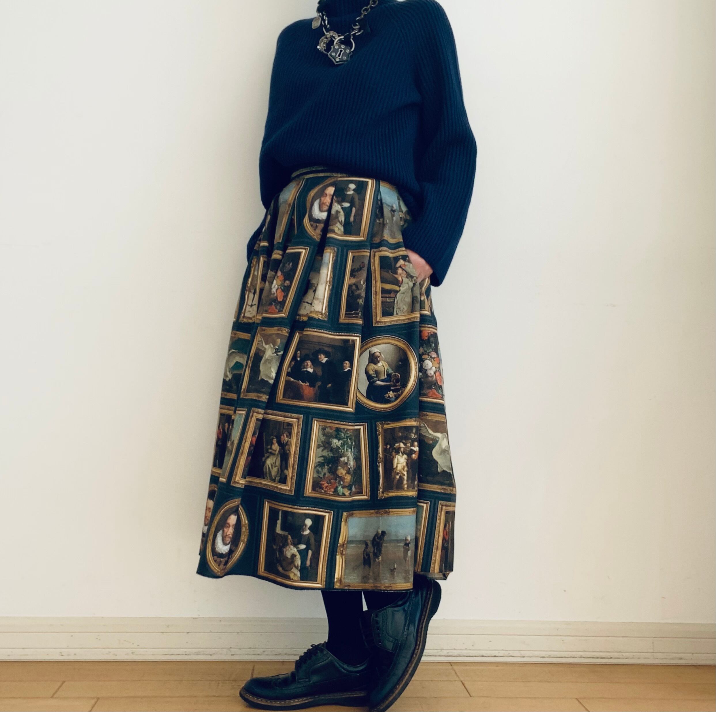 このスカートを履いていると、まるで美術館を歩いているような気分になります。芸術とファッションが融合したこの一枚は、きっとあなたの魅力を引き出し、周りの人々を魅了することでしょう。