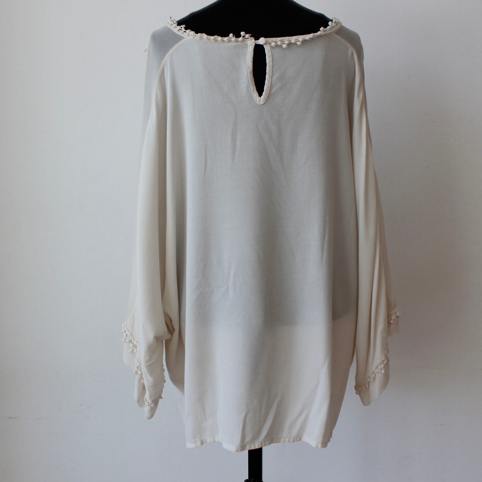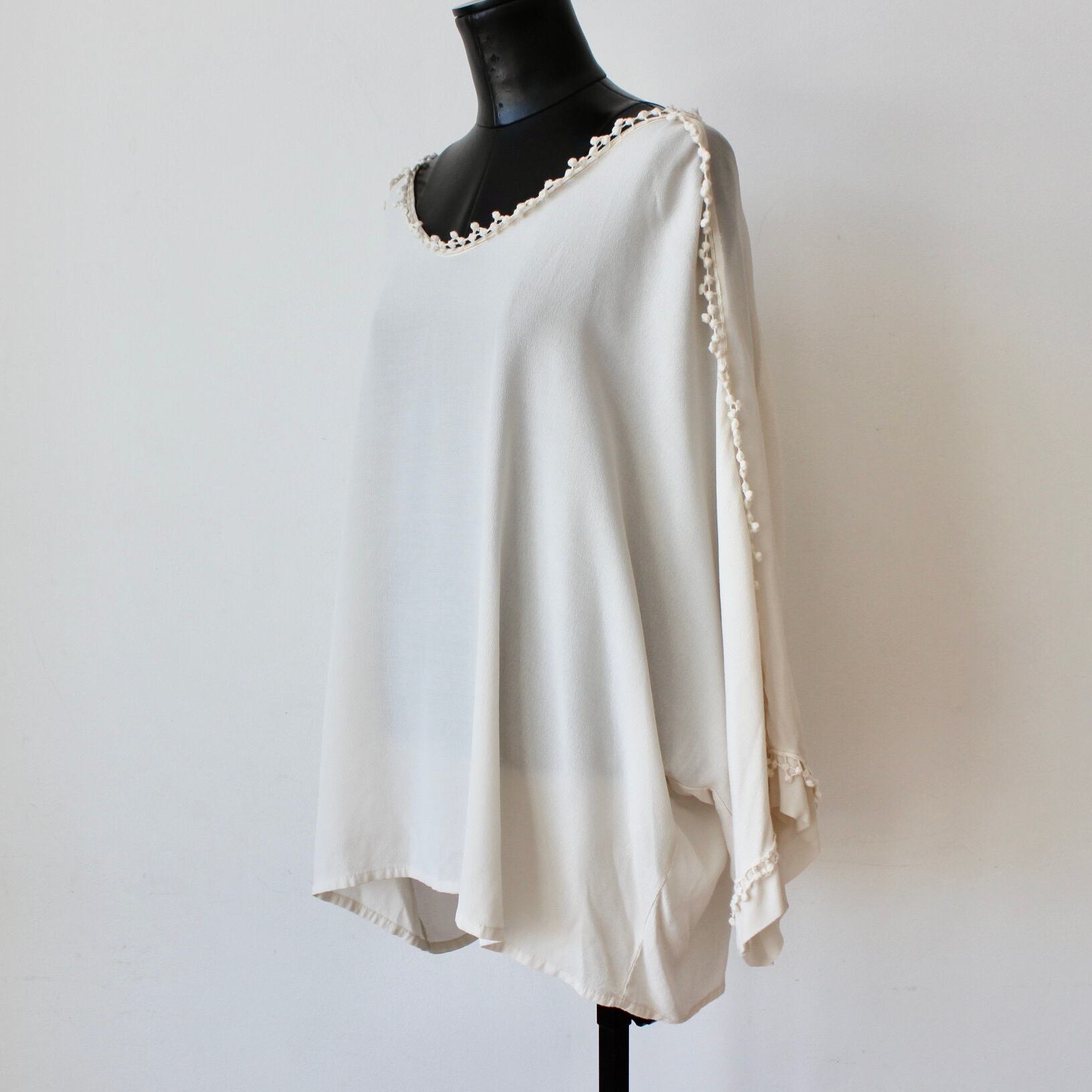 フリーサイズ:身幅60cm 袖丈46cm 肩幅50cm 総丈64cm+後ろ10cm アームホール70cm 裾幅62cm