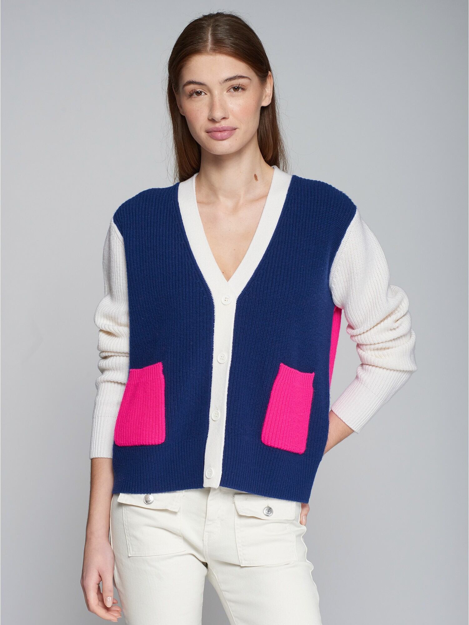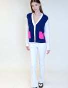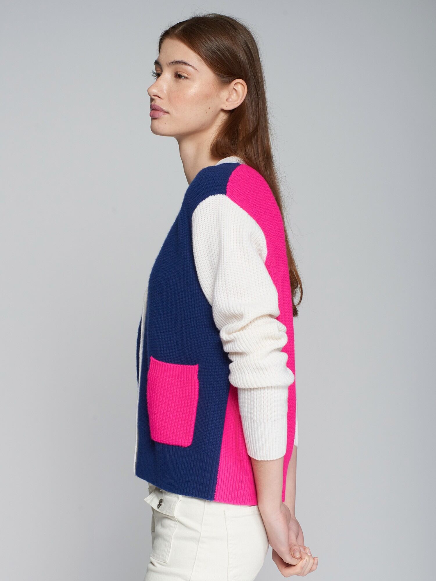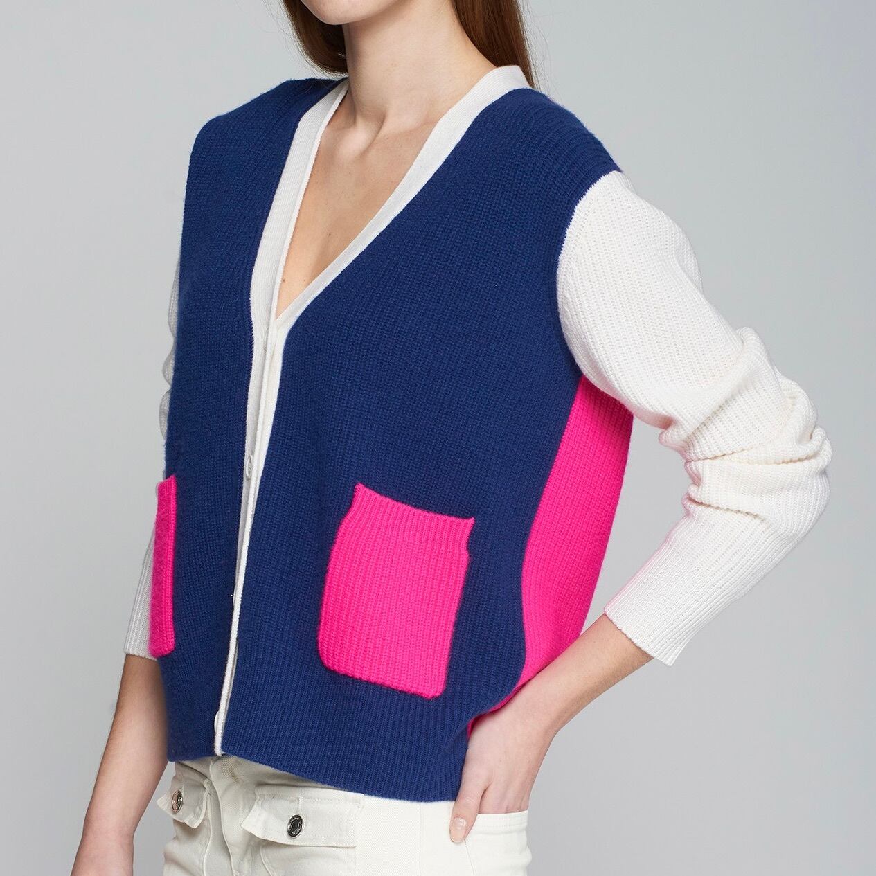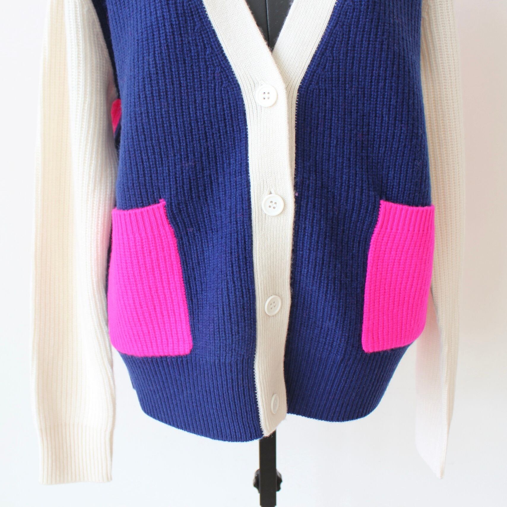 **VILAGALLO マルチカラー切り替えVネックウールカーディガンは、スペインブランドVILAGALLOによる洗練されたざっくりデザインが魅力のカーディガンです!ブルーピンクホワイトの切り替えデザインが特徴で、シンプルながらも個性的なスタイルを演出します。Vネックが首元を美しく見せ、上質なウール素材を使用しているため、暖かさと快適な着心地をお楽しみいただけます。デイリーユースから特別な日まで、幅広くご利用いただける一着です。**